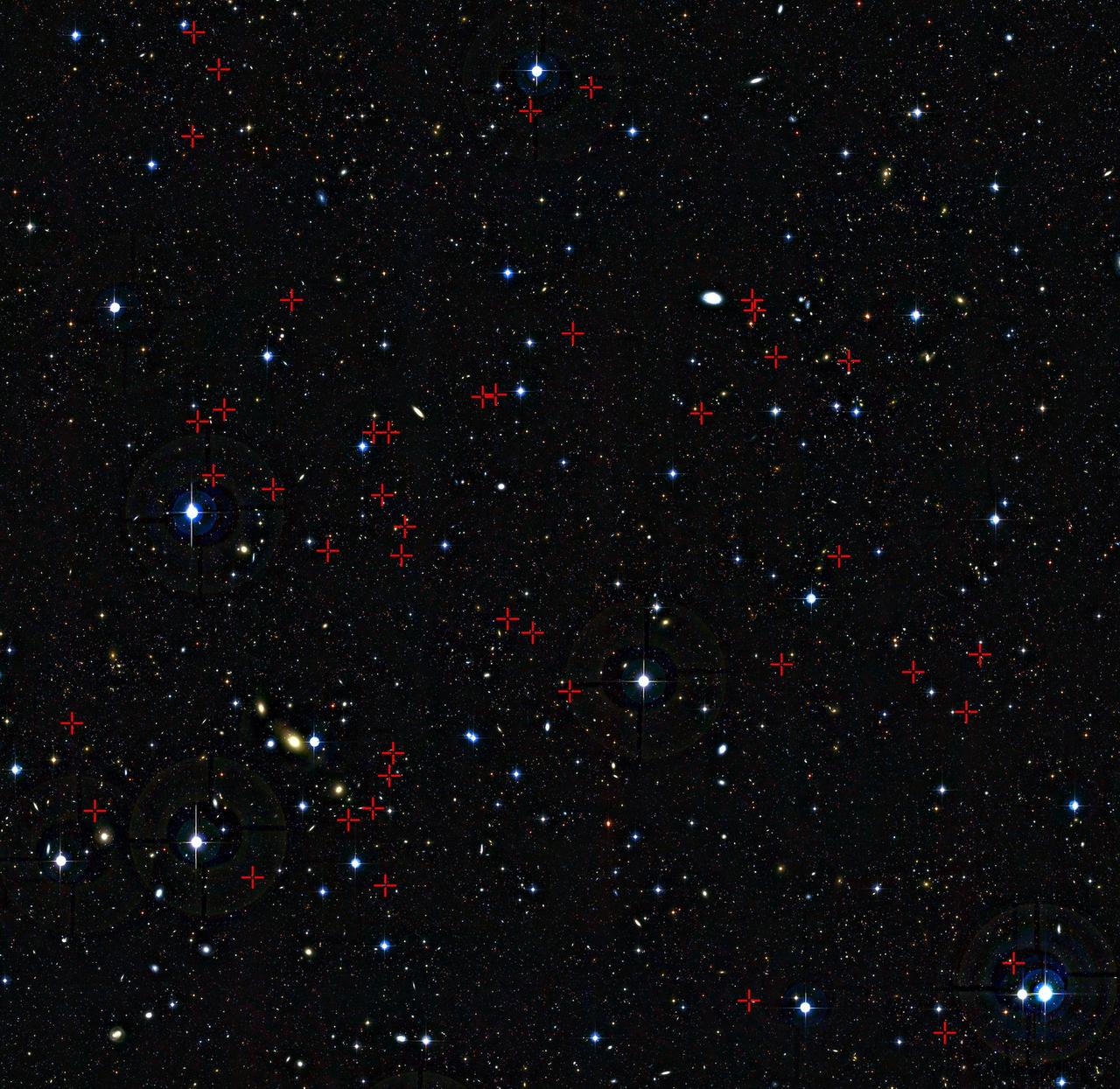 Astronomowie całkiem niedawno użyli potężnego teleskopu zwanego Very Large Telescope (Bardzo Duży Teleskop) do szpiegowania galaktyk w trakcie ich… obiadu. Na zdjęciu powyżej możemy odnaleźć oznaczone za pomocą czerwonych krzyżyków niektóre galaktyki, które obserwowali.