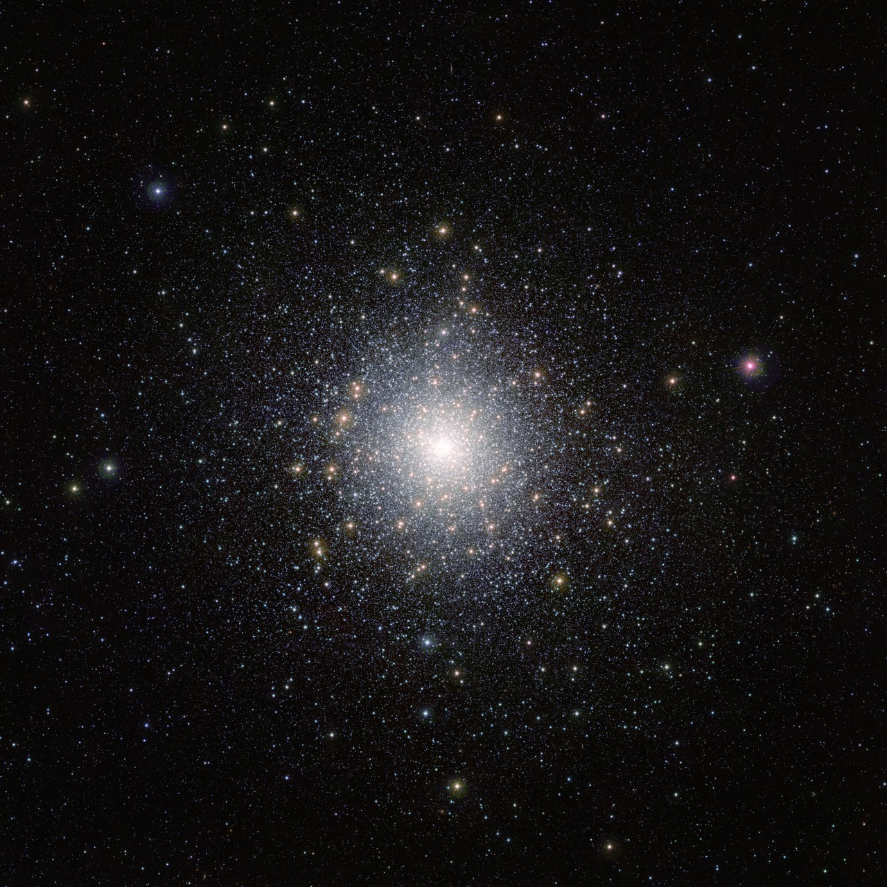 Deze bolvormige sterrenhoop draait rondjes om onze Melkweg. Ook al is hij heel ver weg, aan de nachtelijke hemel verschijnt hij even groot als de maan. Een lichtstraal doet er 120 jaar over om van de ene kant van deze sterrenhoop naar de andere kant te komen. Licht reist sneller dan alles, dus je kunt wel zeggen dat deze sterrenhoop enorm is! Het is een van de grootste en helderste bolvormige sterrenhopen die we kennen en hij is zelfs zichtbaar met het blote oog. Vanaf het zuidelijk halfrond is hij net naast de Kleine Magelhaense Wolk te zien – het dwergsterrenstelsel dat de astronomen wilden fotograferen.