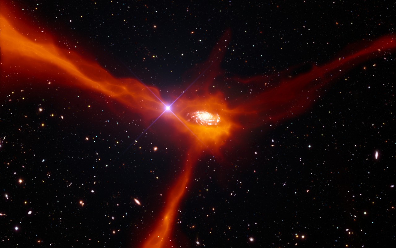 Possiamo ammirare questo spettacolo perché il centro estremamente luminoso di una galassia lontanissima è allineato perfettamente, nella nostra linea di vista, dietro alla galassia che sta facendo rifornimento di gas. La luce della galassia lontanissima, allora, prima di raggiungere i nostri telescopi deve attraversare tutta la polvere cosmica che circonda la galassia affamata, e così facendo la espone sotto ai nostri riflettori e ci permette di studiarla!