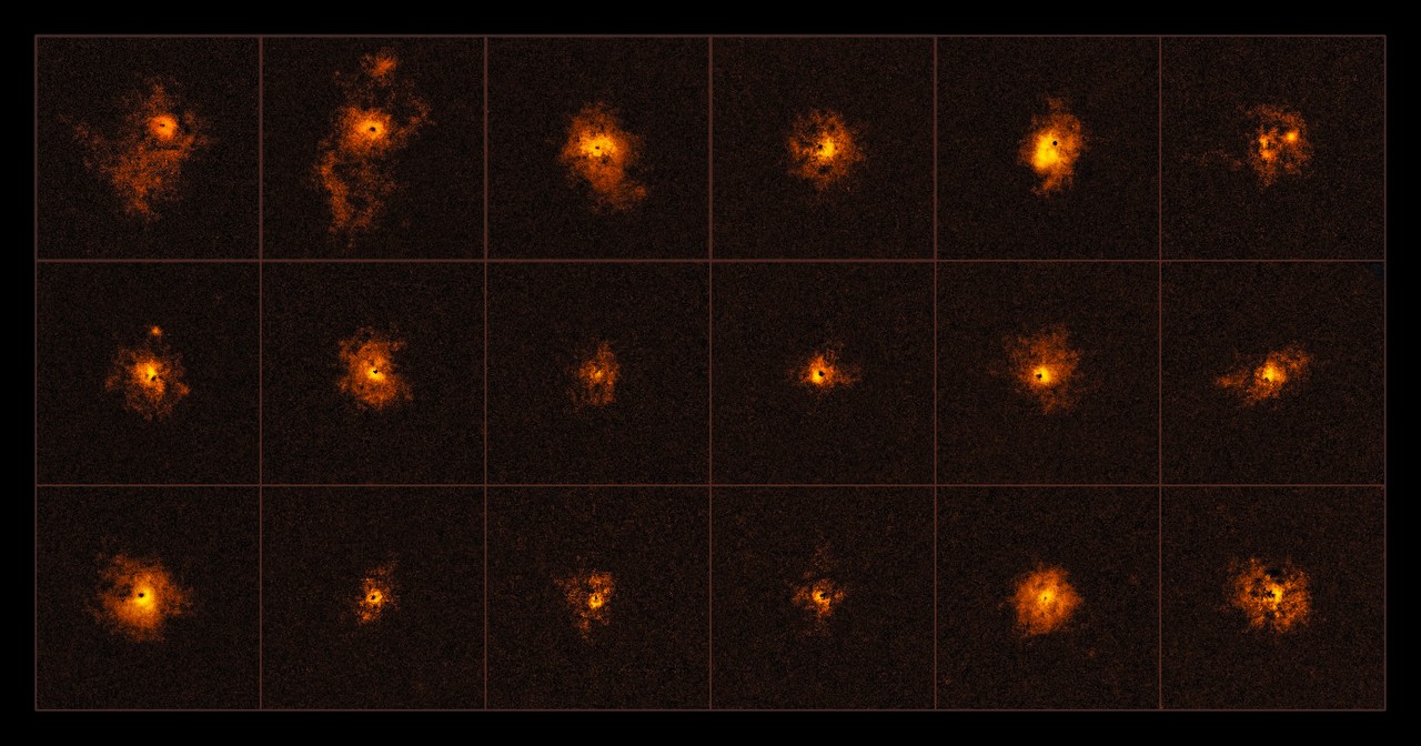 Do tej pory przypuszczaliśmy, że 1 na 10 kwazarów posiada halo. Ale teraz, po spojrzeniu w niebo za pomocą mocniejszych teleskopów okazało się, że wszystkie kwazary mają taka otoczkę! Powyższe zdjęcie jest zestawieniem pokazującym 18 obserwowanych kwazarów, z których każdy otoczony jest świecącą otoczką.