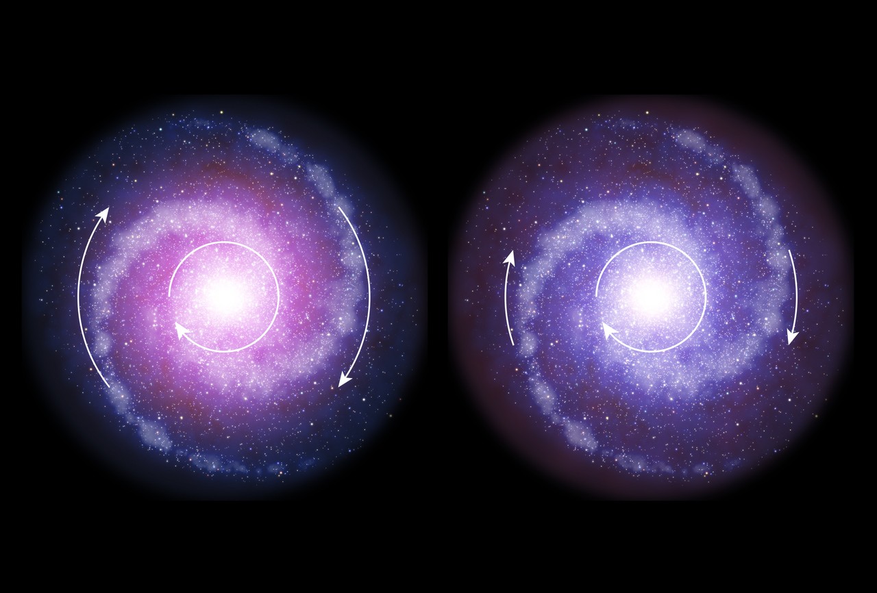 Maar sterrenkundigen hebben kortgeleden ontdekt dat dit niet zo was toen het Universum nog jong was. Doordat ze keken naar oude sterrenstelsels, ontdekten ze dat de buitenkant langzamer draaide dan de plekken in het midden.
