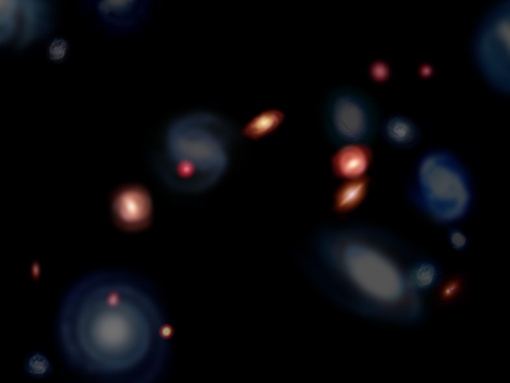 Met de ALMA radiotelescoop hebben astronomen een groep nooit eerder waargenomen "normale sterrenstelsels" ontdekt. Eerder zaten die verstopt achter dikke stofwolken. In dit plaatje zijn de nieuw ontdekte sterrenstelsels afgebeeld in rood. De blauwe sterrenstelsels zijn eerder al waargenomen met 'normaal' zichtbaar licht.
