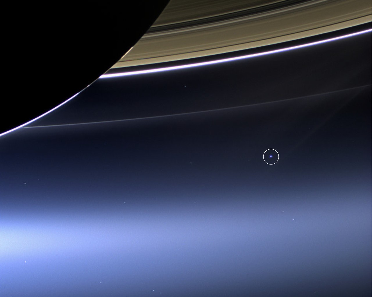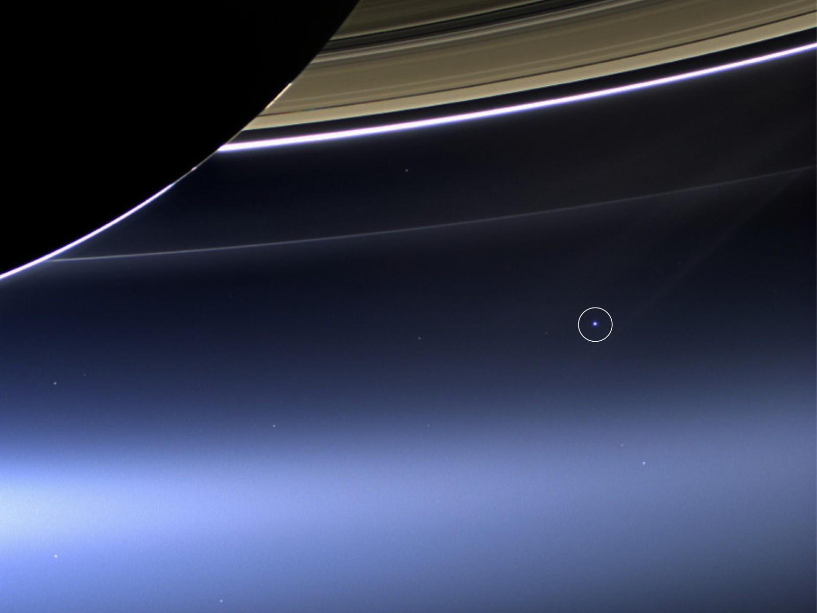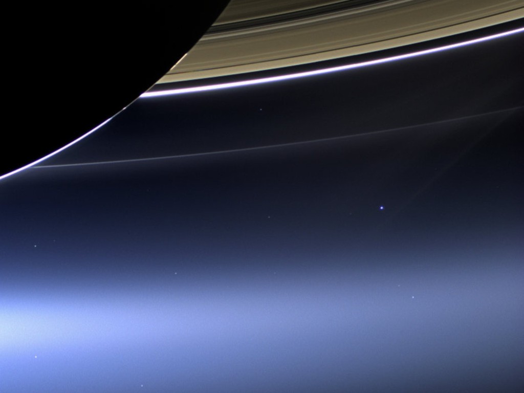 Op 19 juli 2013 cirkelde de satelliet Cassini om Saturnus - een miljard kilometer van ons verwijderd - en draaide zich om zodat hij een foto kon maken van de Aarde! De fotoshoot was perfect getimed zodat het felle licht van de Zon was geblokkeerd door Saturnus zelf. De prachtige planeet verschijnt groot op de voorgrond van de foto, samen met zijn complete ringensysteem, en de Aarde verschijnt in de verte als een ‘vale blauwe punt’. Het lijkt misschien een kleine foto, maar we staan er allemaal op, alle miljarden mensen op Aarde.