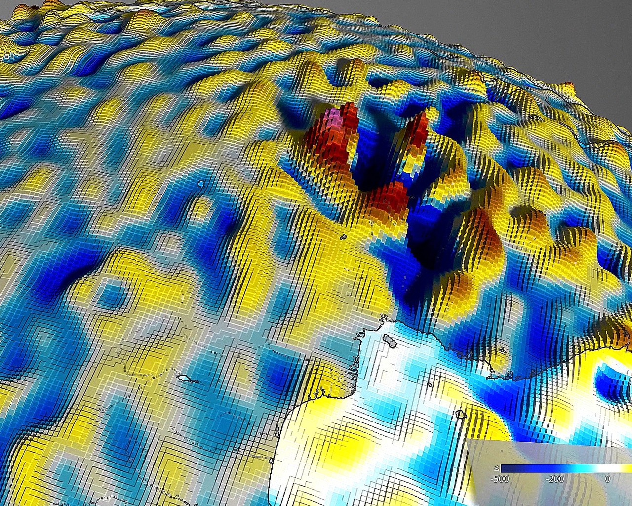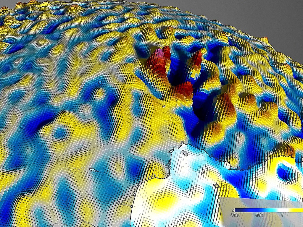 De Swarm satellieten zijn gebruikt om deze afbeelding te maken – de meeste gedetailleerde map van het magnetisch veld van de Aardkorst ooit! Zwakkere delen van het magnetische veld zijn blauw en de sterkste gebieden zijn rood gekleurd. De verschillen worden veroorzaakt door de vorm van de Aardkorst.
