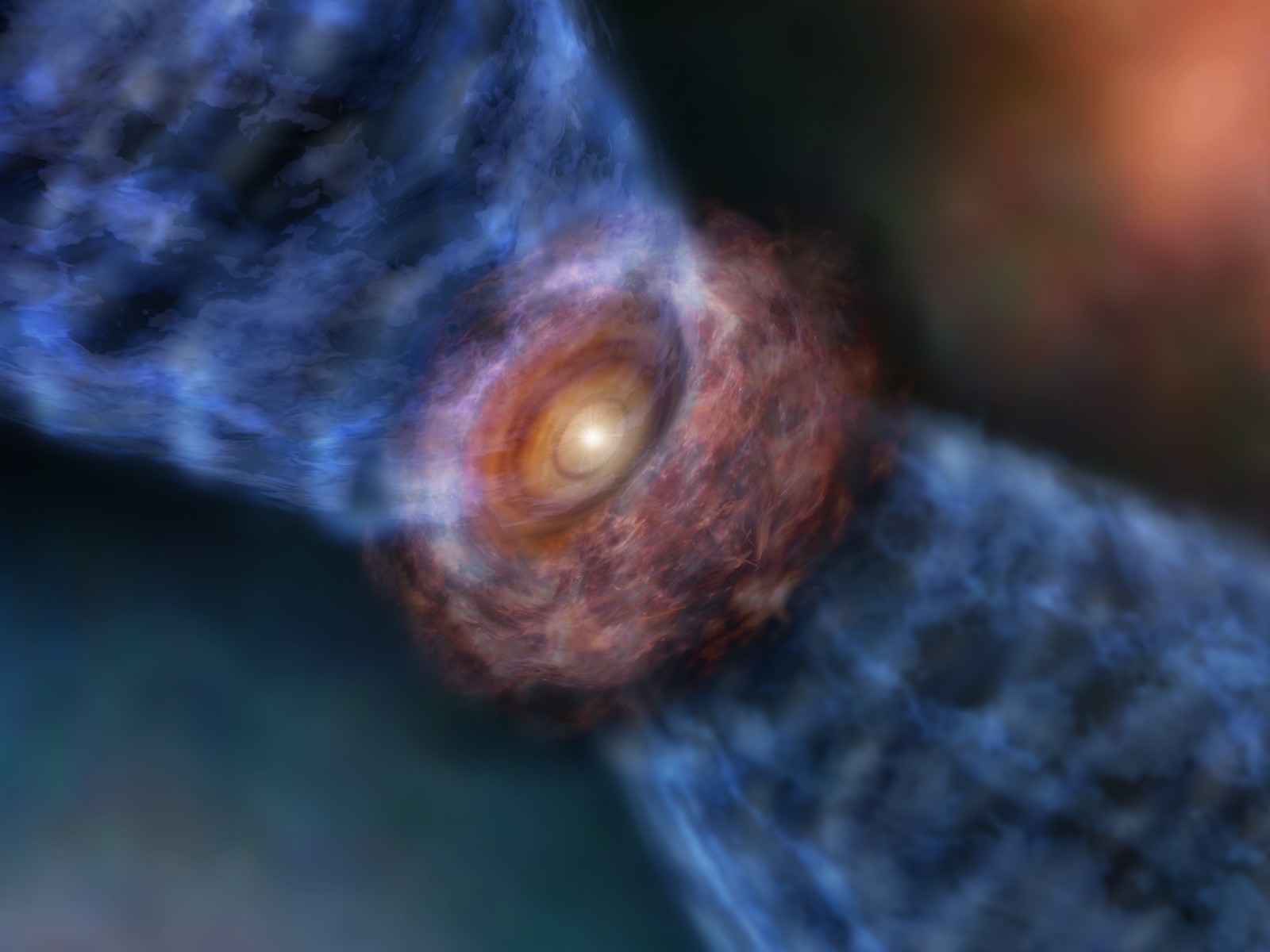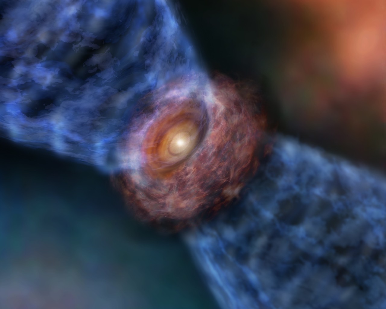 Een artiest maakte deze afbeelding om ons een uitvergrote beeld te geven van de enorme, jonge ster 'Orion KL Bron 1'. Zoals je ziet, is de ster omringd door een schijf van gas en stof, dat de jonge ster langzamer en langzamer doet draaien.