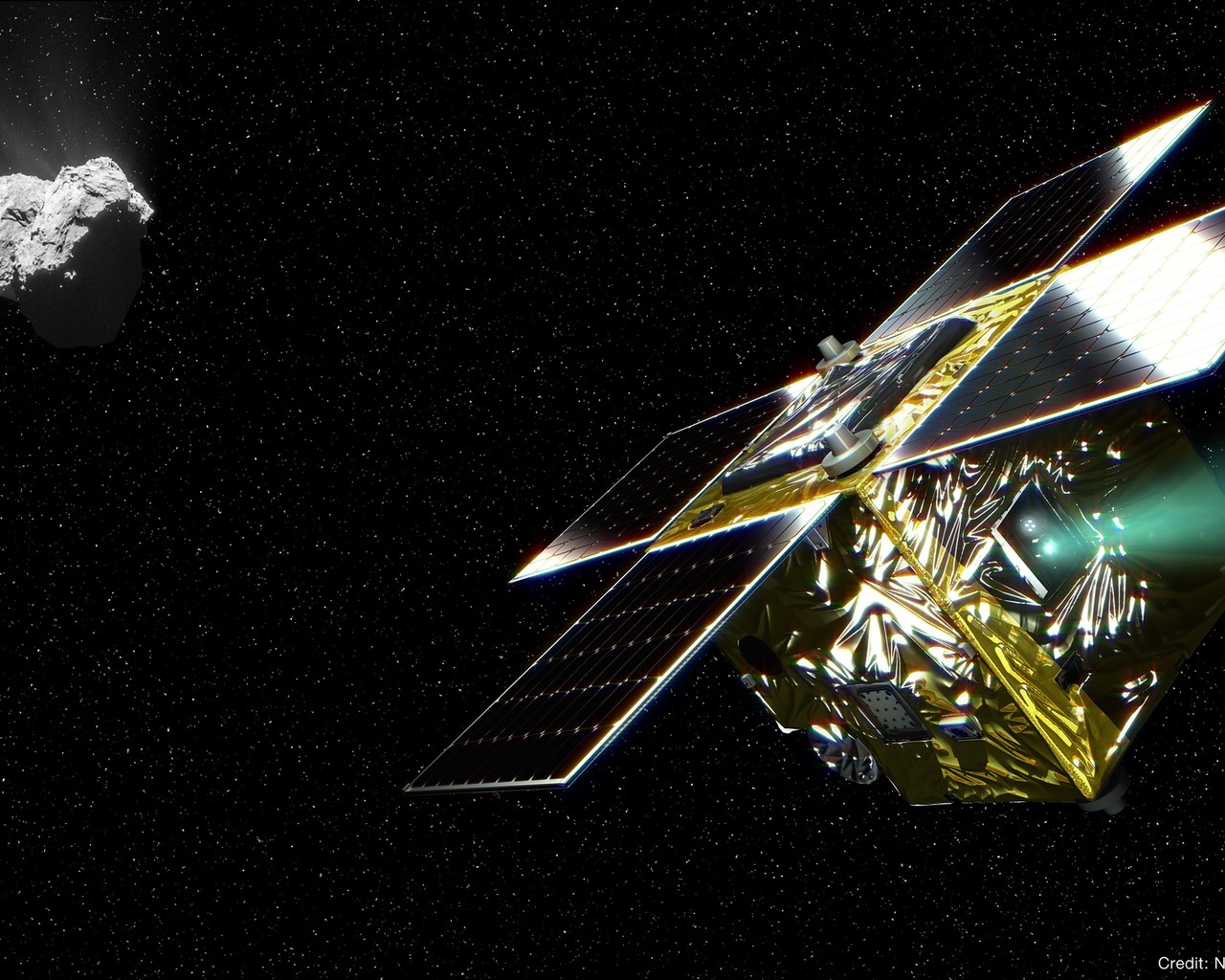 Een artiest maakte deze afbeelding om ons de PROCYON ruimtesonde and komeet 67P/Churumov-Gerasimenko te laten zien.