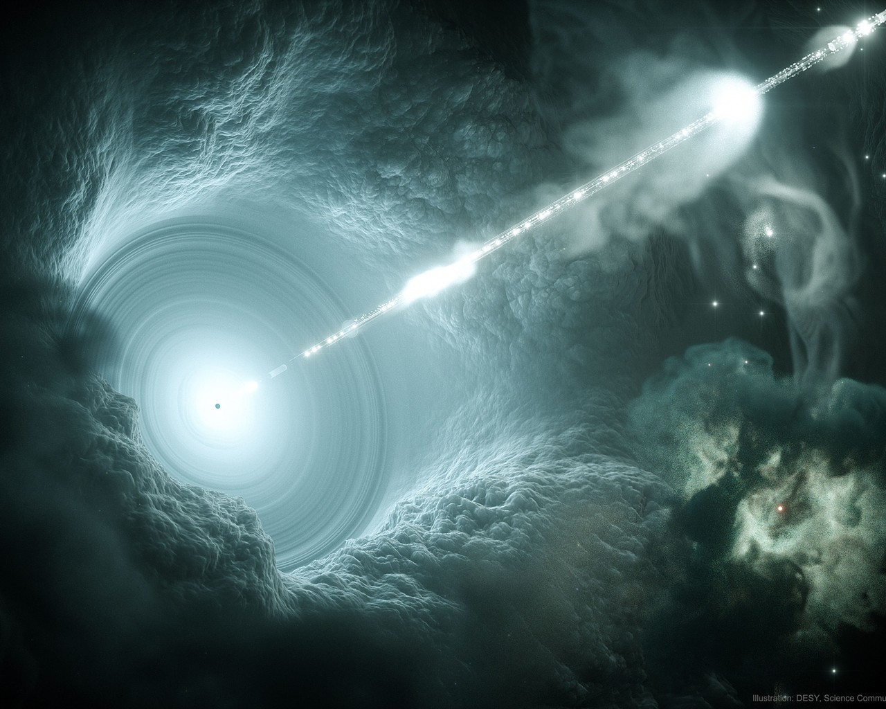 Een kunstenaar heeft deze afbeelding gemaakt om ons een beeld te geven van hoe een superzwaar zwart gat er van dichtbij uitziet. Het zwarte gat slokt materiaal op in het centrum van een sterrenstelsel en scheurt het in kleine stukjes, waarna het hoge-energie-stralen richting de Aarde stuurt. We noemen een sterrenstelsel met zo’n zwart gat een blazar en we zijn er net achtergekomen dat zulke sterrenstelsels deeltjes met enorm veel energie afschieten, neutrino’s genaamd.