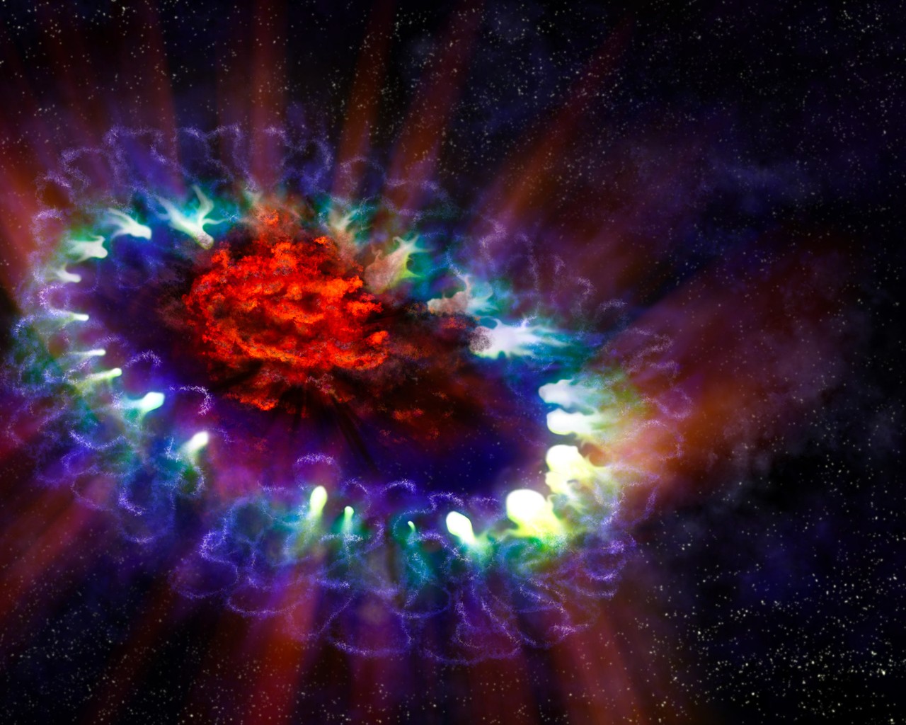 Deze afbeelding toont een ontplofte ster die sterrenkundigen onlangs hebben verkend, terwijl ze zochten naar ingrediënten die nodig zijn voor nieuwe planeten, sterren en mensen. En hun zoektocht was geslaagd! Verborgen in deze gasresten, vonden ze een stoffabriek, die hard bezig was met het maken van nieuwe moleculen.