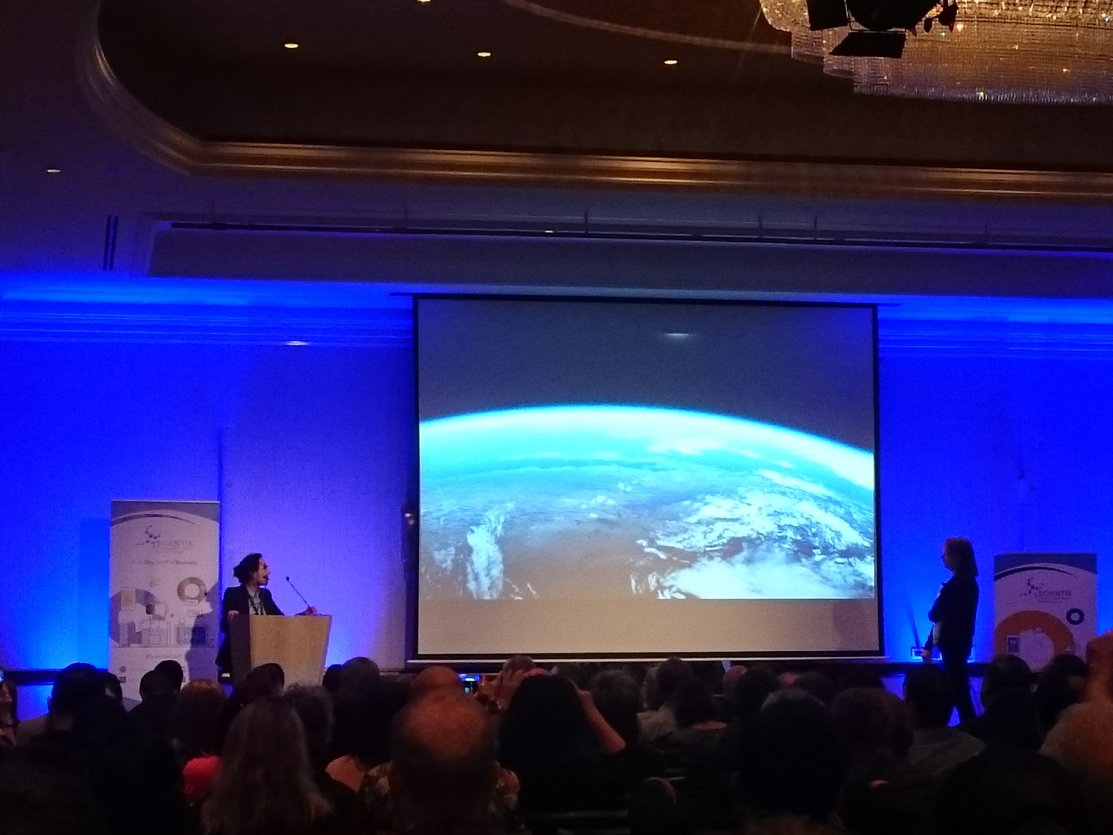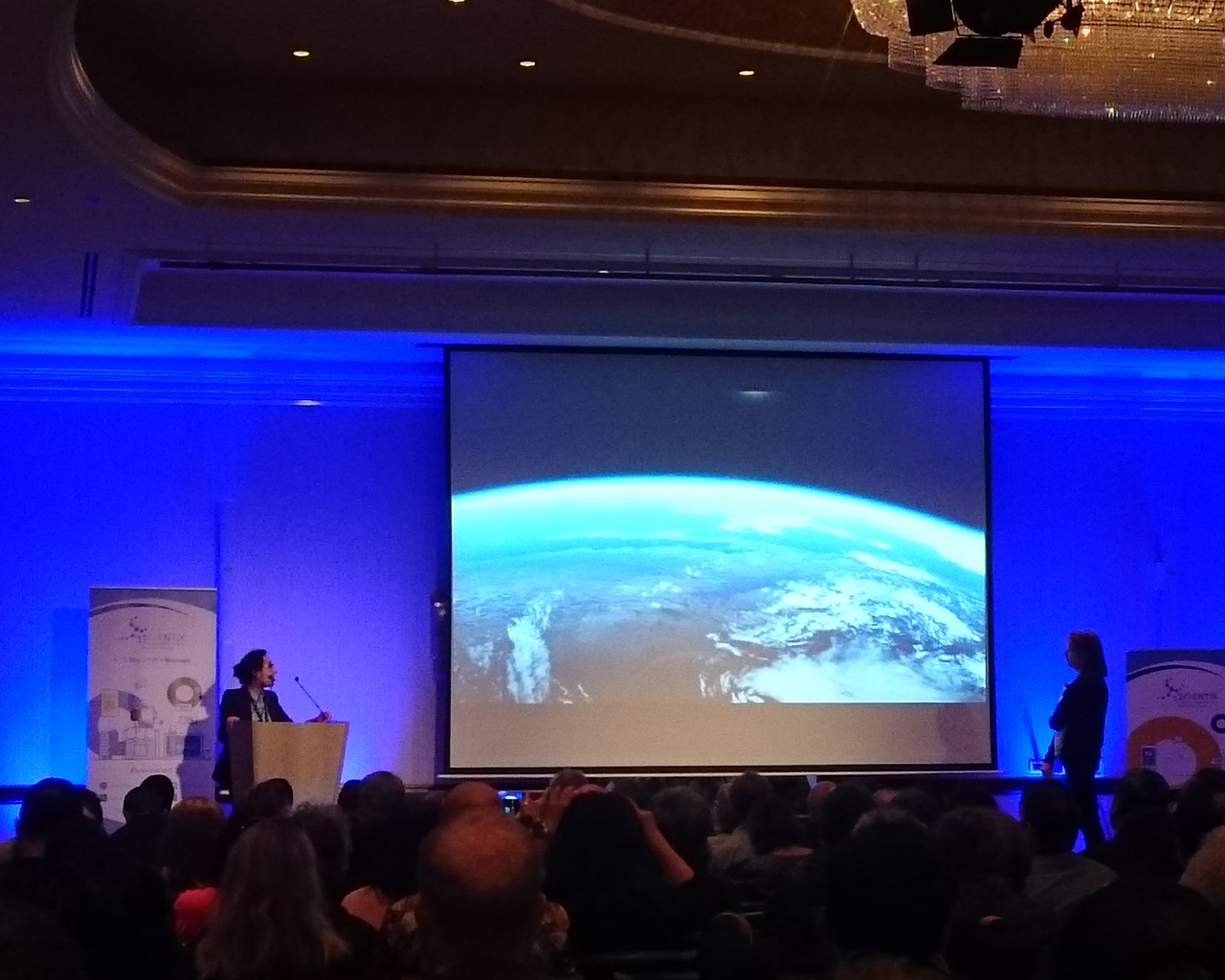 Mahbobah Ahmadi houdt een presentatie over de projecten van de Astronomy & Society Group tijdens de plenaire sessie van Scientix 2018