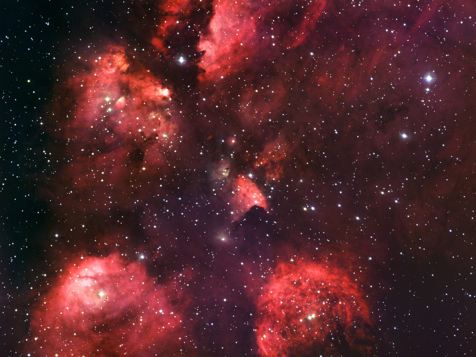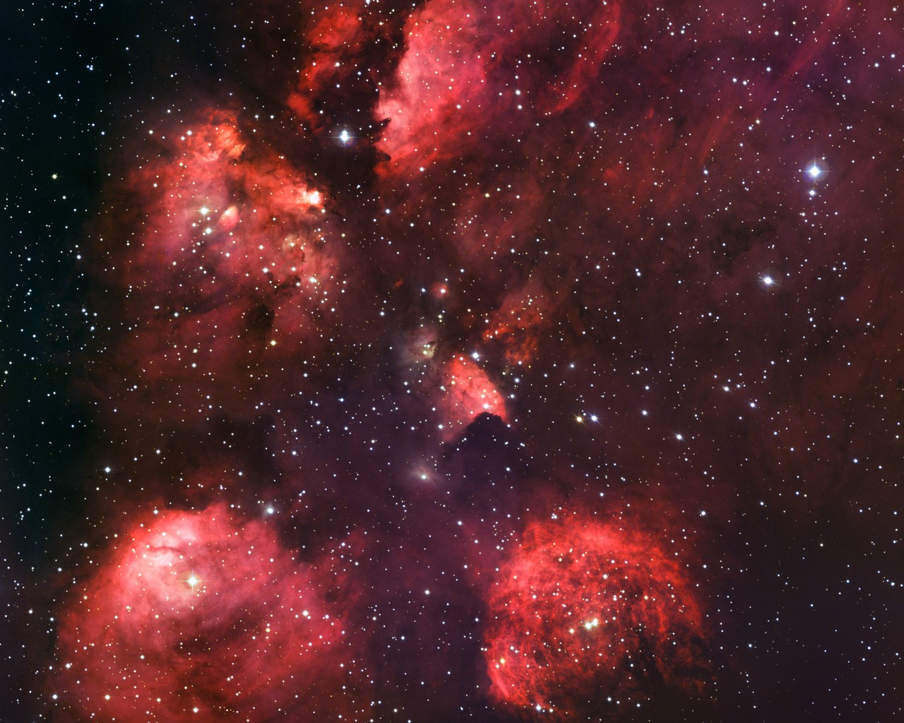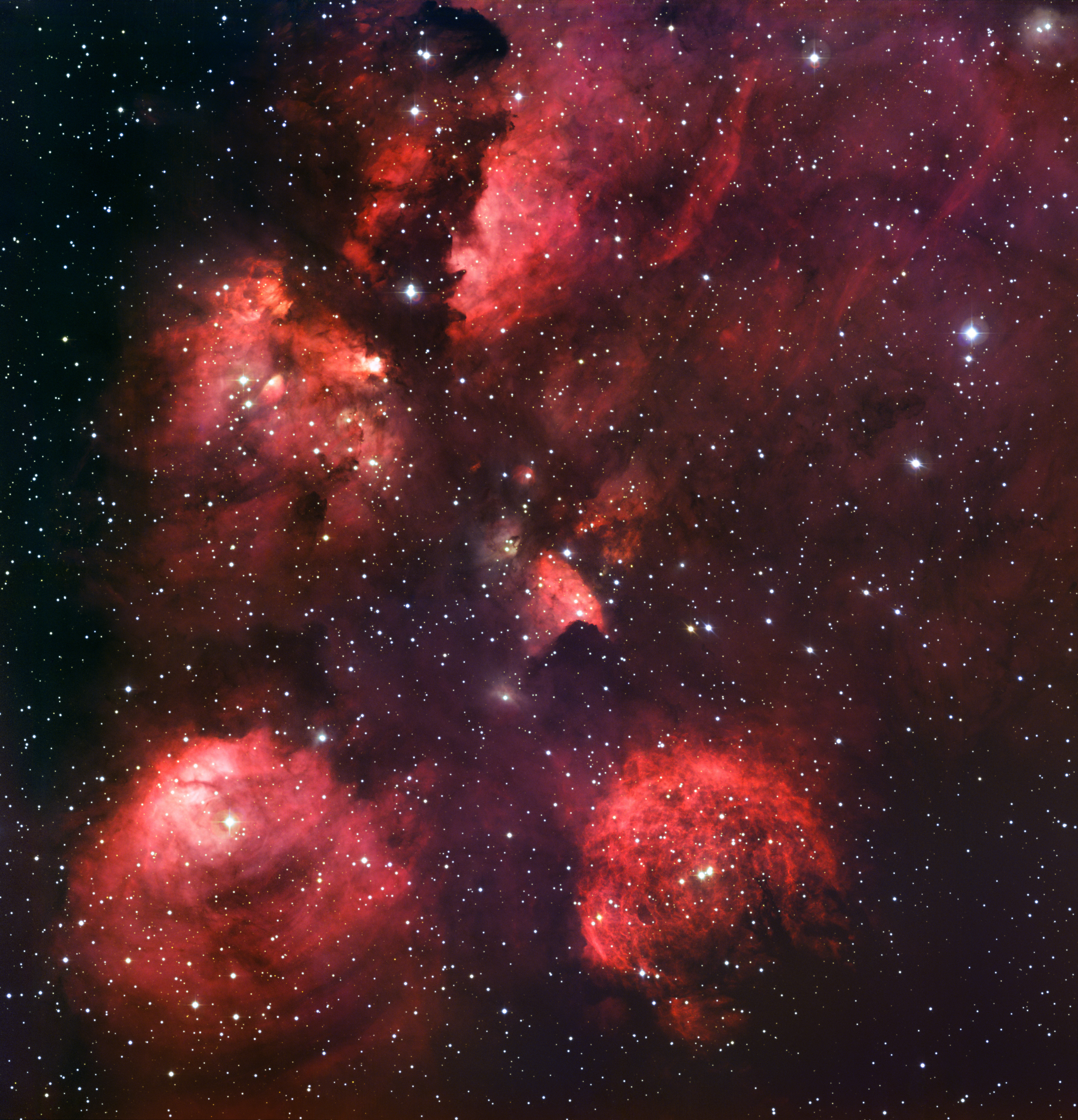 Op deze prachtige ruimtefoto zie je een gebied waar nieuwe sterren worden gevormd. De jonge, hete sterren schijnen zó helder dat het gas om hun heen rood gaat gloeien. Dit gebied heet de Kattenklauwnevel omdat het lijkt op de pootafdruk van een kat!