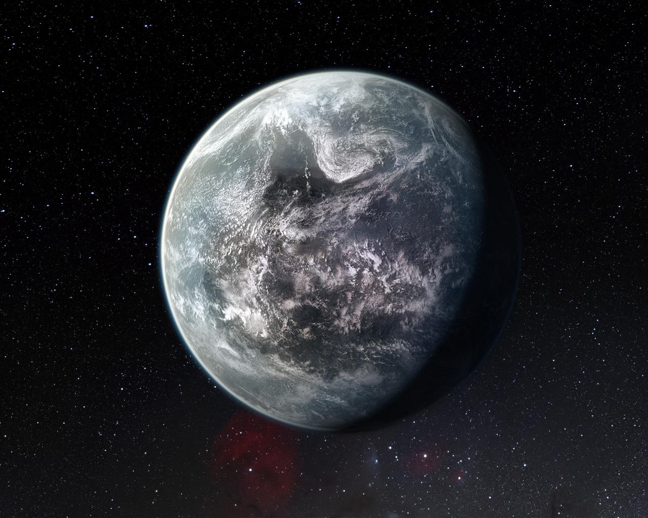 Hierboven zie je een illustratie van een zogenaamde 'super-aarde'. Een super-aarde is een exoplaneet die maar één tot tien keer zo zwaar als onze aarde is!