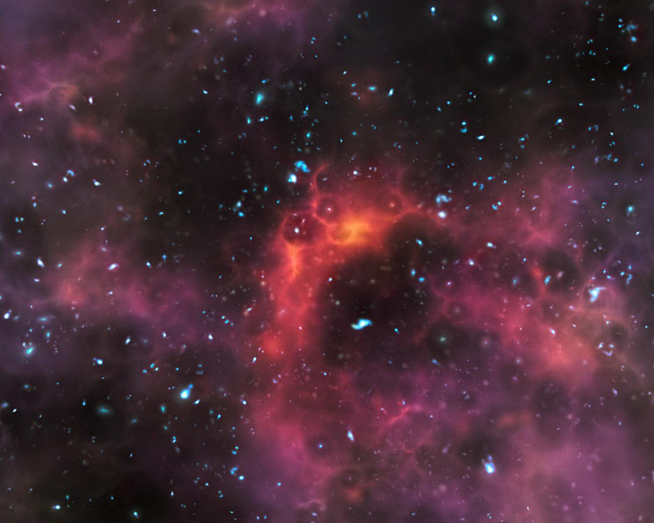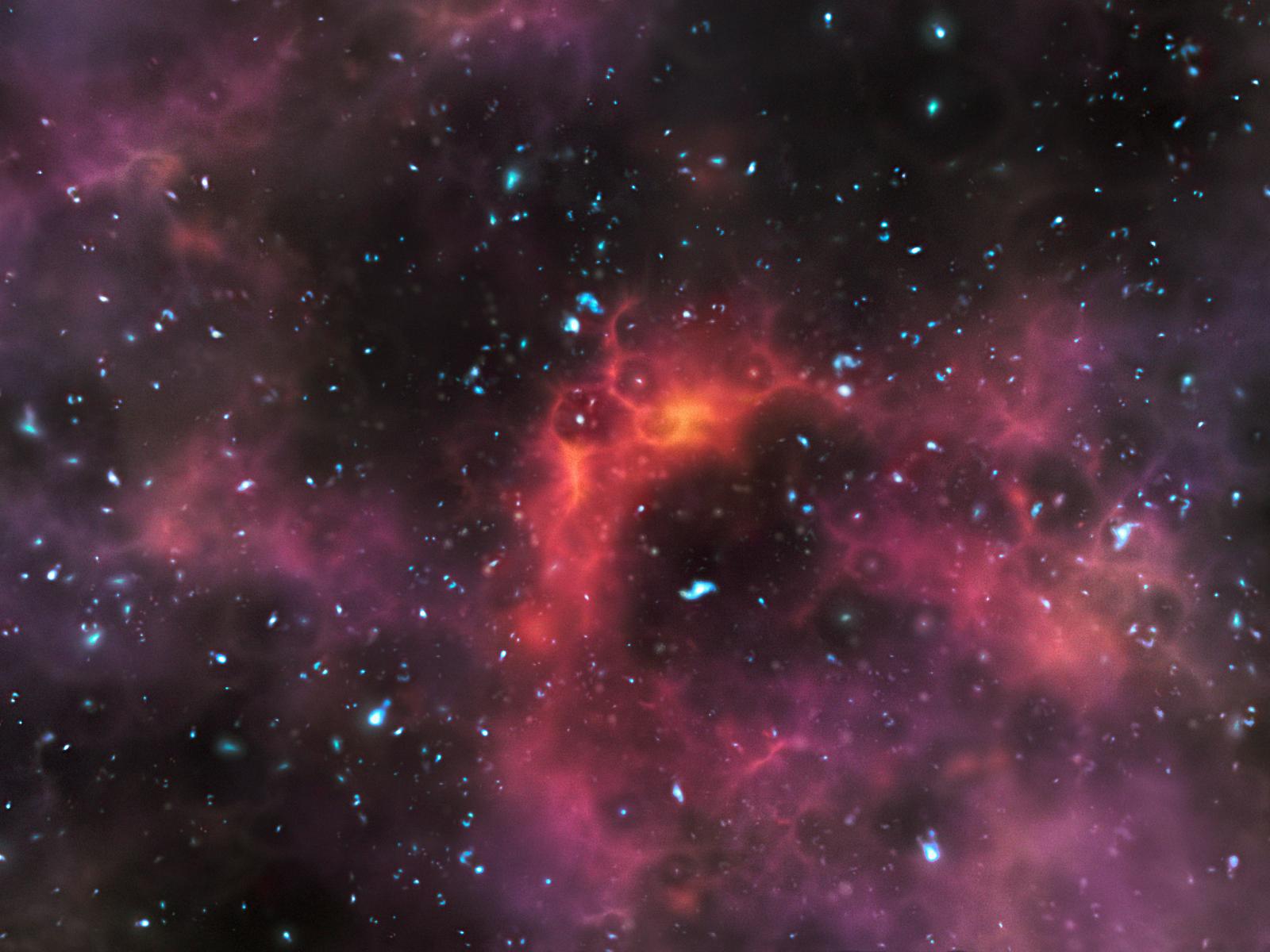 Toen de eerste sterren en sterrenstelsels ontstonden, was het heelal gevuld met een hele dichte mist vol met waterstofgas. Door deze mist werd het licht van de sterren verhinderd om door het heelal te reizen. Het plaatje hierboven, getekend door een kunstenaar op een computer, laat zien hoe deze jonge sterrenstelsels eruit zagen.