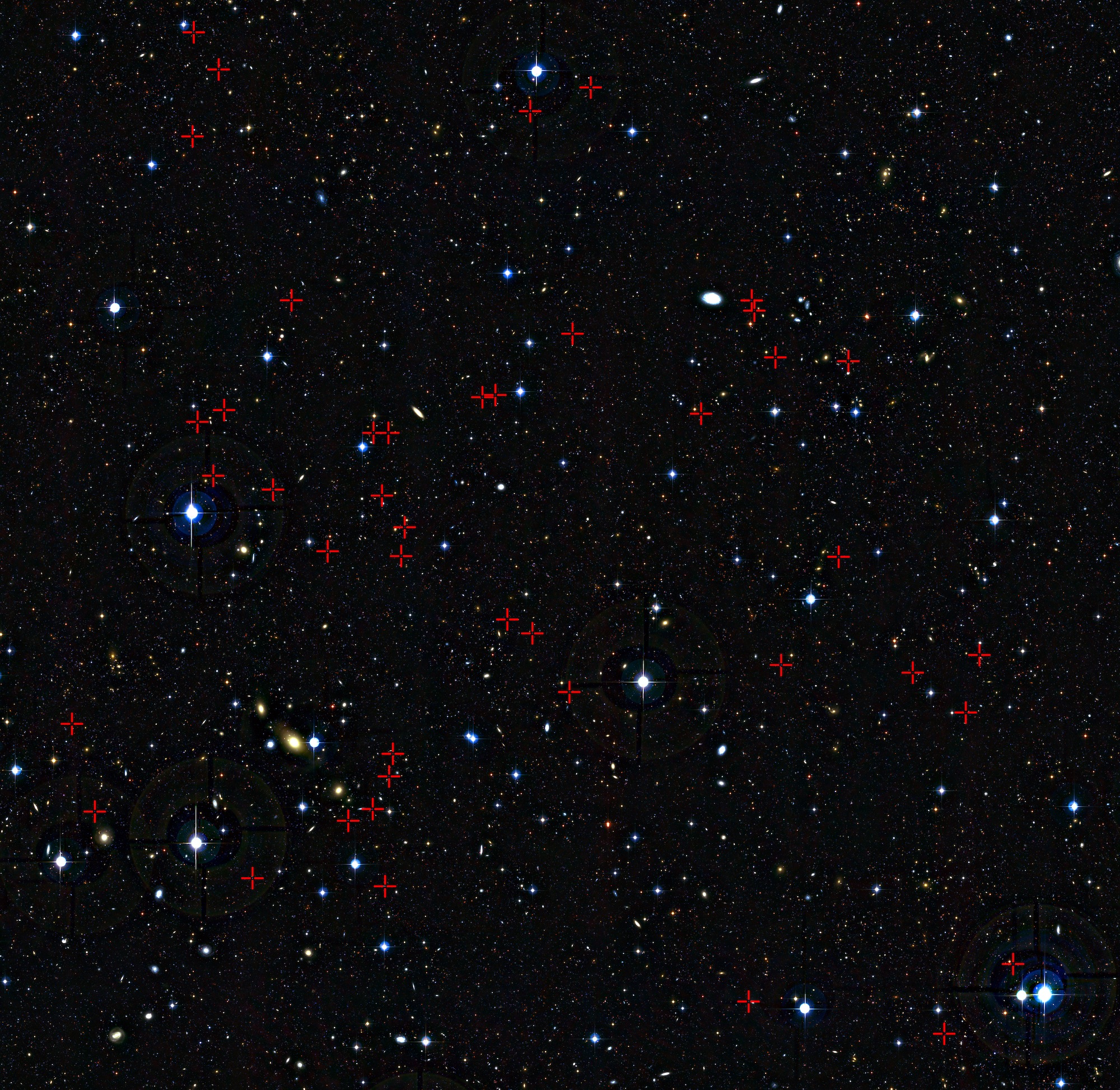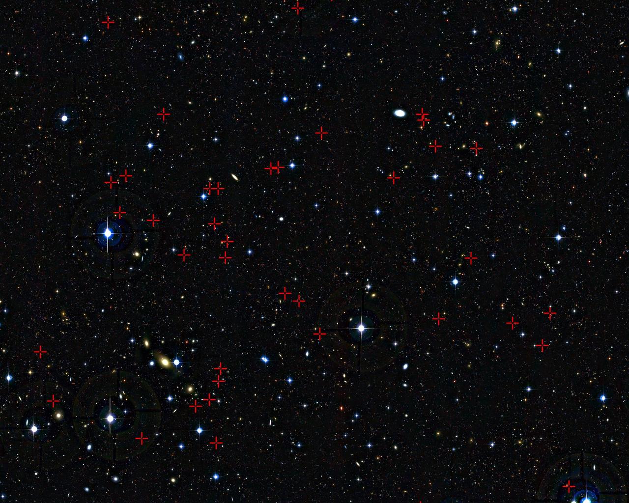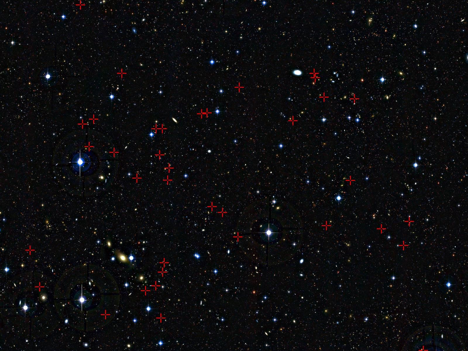Nu hebben astronomen met de Very Large Telescope (VLT) gekeken naar de manier waarop sterrenstelsels zich voeden. De foto hierboven geeft met rode kruisjes de sterrenstelsels aan die zijn bestudeerd.