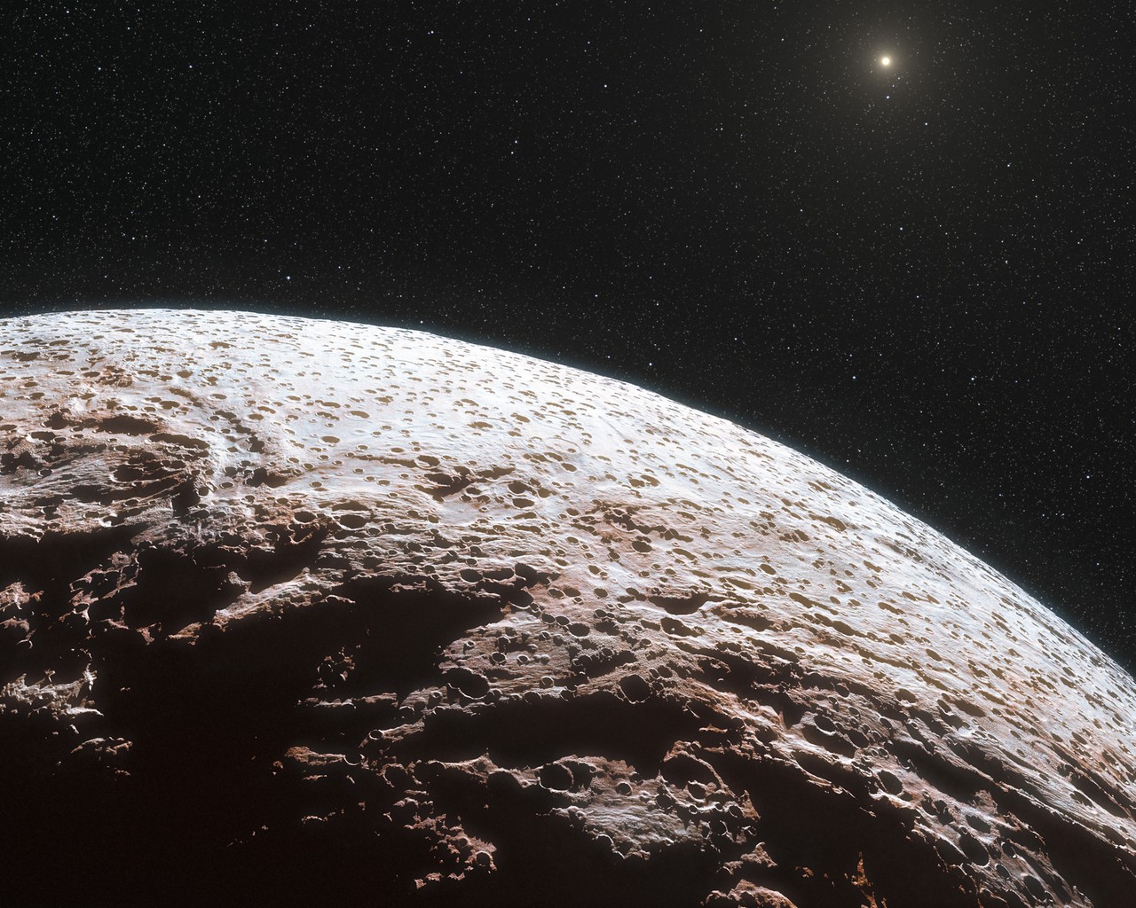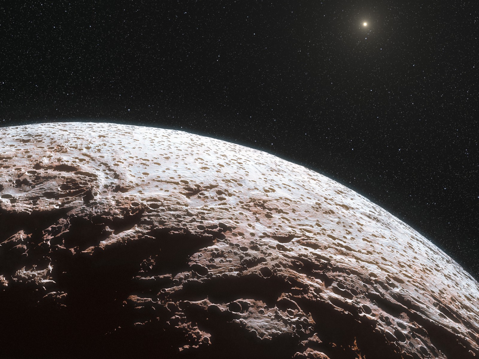 Makemake, een dwergplaneet in ons zonnestelsel, blijkt geen atmosfeer te hebben; hij is kaal! De weinige zonnestralen die hij ontvangt op grote afstand - hij staat zelfs verder weg van de zon dan zijn neef Pluto - kan hij niet vasthouden.