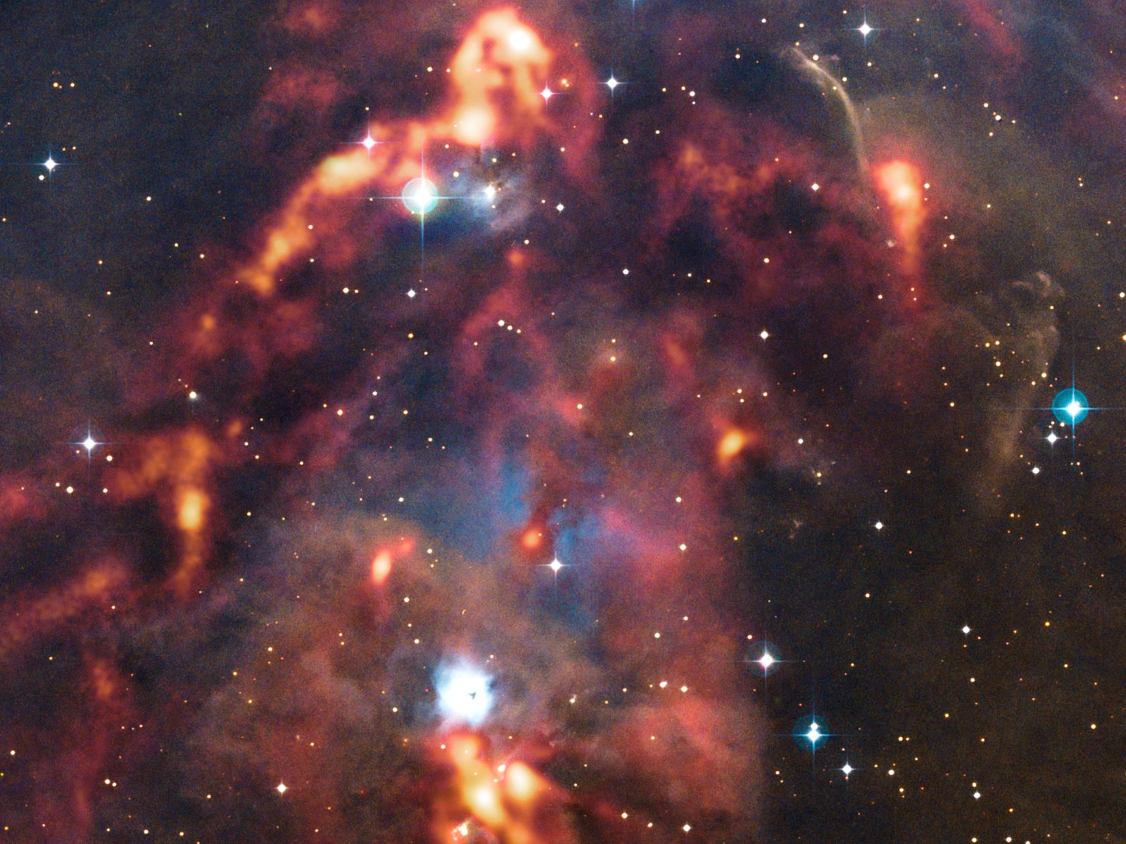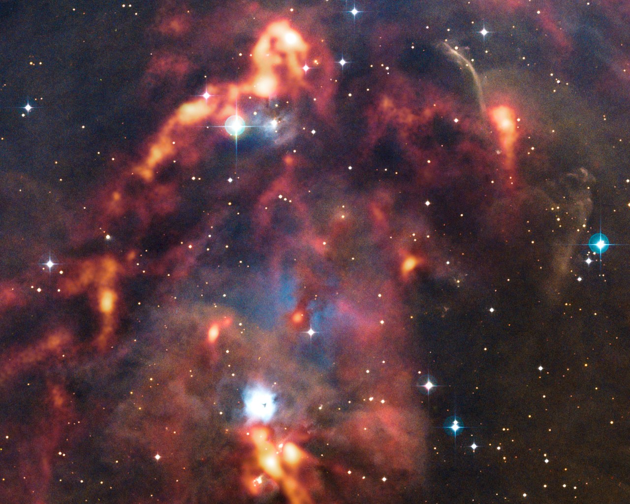 Deze foto is genomen met zo'n nieuwe telescoop, genaamd APEX. Dit krachtige instrument is ontworpen om de hete gloed van ruimtewolken te bekijken, en zo de schuilplaatsen te vinden van pasgeboren sterren. Hoewel we de sterren zelf niet kunnen zien, verraden ze zichzelf doordat ze de wolken om zich heen opwarmen met hun intense hitte. Deze warme delen van de wolk zijn gefotografeerd door APEX. Het lijkt wel of de sterren de wolk in brand hebben gezet, vind je niet?