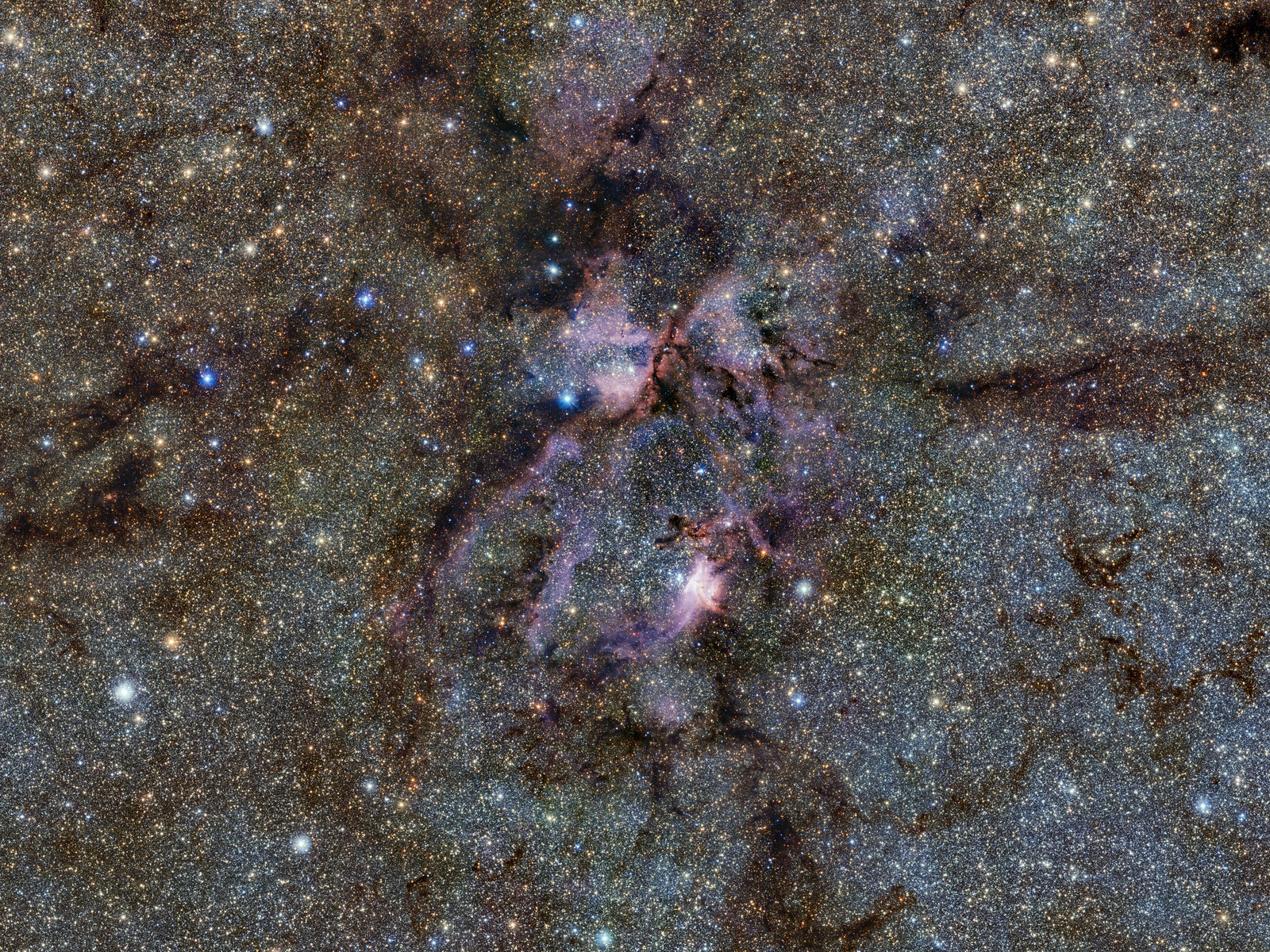 Op de foto zien we een gebied dat is gevuld met grote gaswolken en uitgestrekte slierten van donker stof. We noemen zo’n gebied een nevel. In deze gaswolken groeien sterren die blauw-wit schijnen in zichtbaar licht. Maar VISTA bekijkt de hemel in infrarood licht, een type licht dat wij met onze ogen niet kunnen zien. In zichtbaar licht - het soort licht dat we wel met onze ogen kunnen zien – ziet deze nevel er héél anders uit. Neem hier maar eens een kijkje, en misschien begrijp je dan wat beter waarom deze nevel ook wel de Kreeftnevel wordt genoemd.