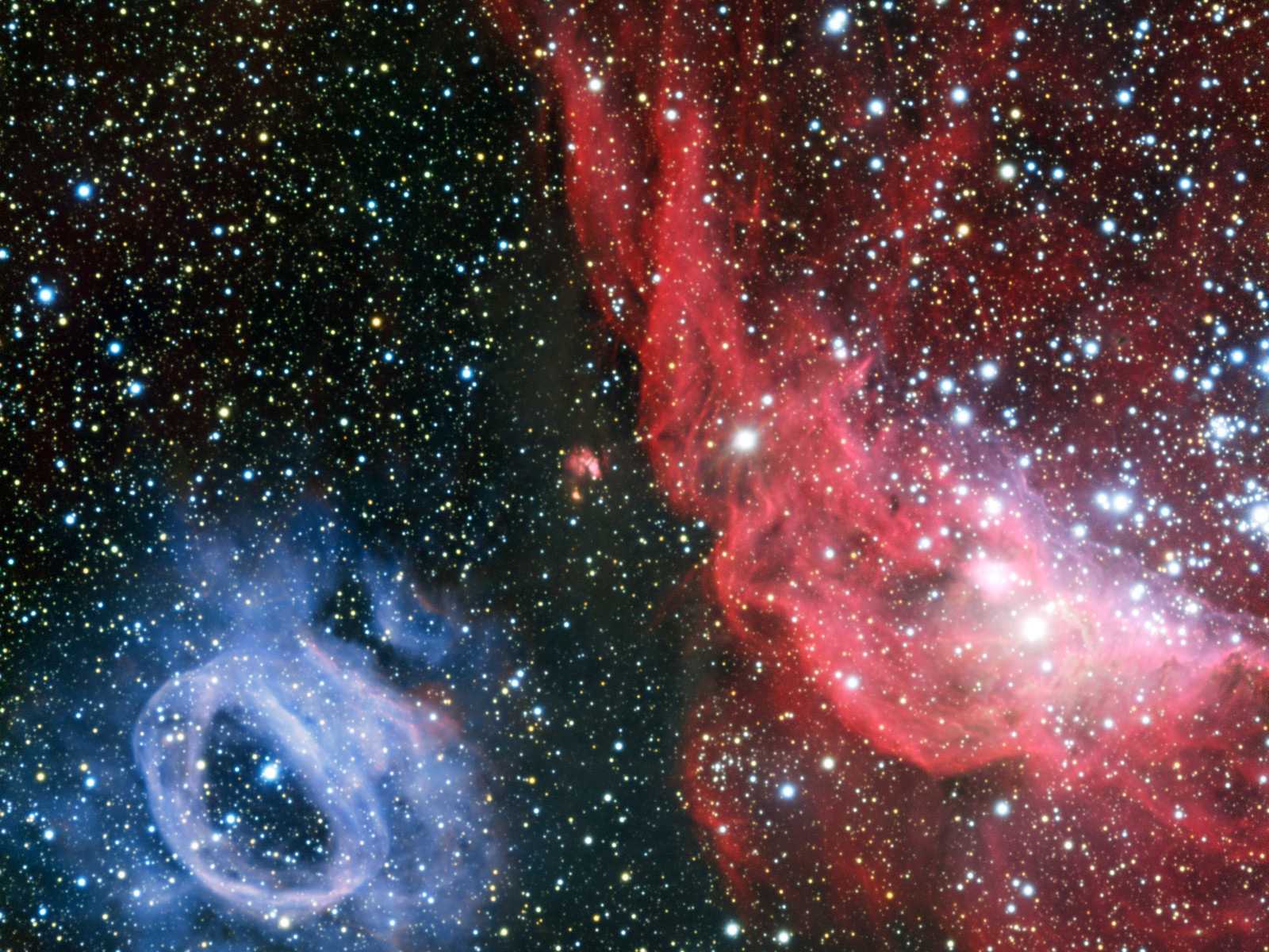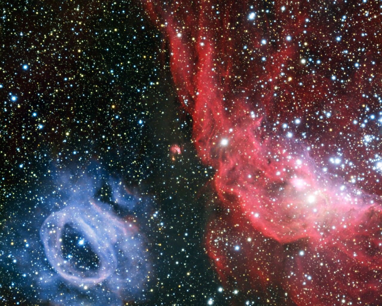 Deze foto is een close-up van de Grote Magelhaense Wolk, een dwergstelsel dat om de Melkweg draait. Er zijn twee wolken van gas en stof te zien waarin sterren ontstaan. Deze twee wolken zouden een ‘tweeling’ kunnen zijn omdat ze in hetzelfde dwergstelsel zijn ontstaan. Ze worden ook allebei opgelicht door extreem hete, jonge sterren in hun binnenste. Maar ze zien er heel verschillend uit: de ene wolk is helderrood en de andere is hemelsblauw. Dit komt door hun chemische kleurenpalet. De blauwe gloed van de linkerwolk geeft aan dat hij uit zuurstof bestaat, terwijl de rode kleur duidt op waterstof.