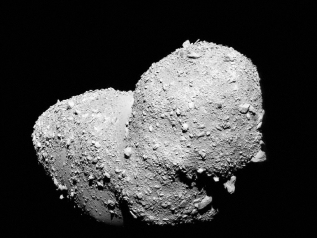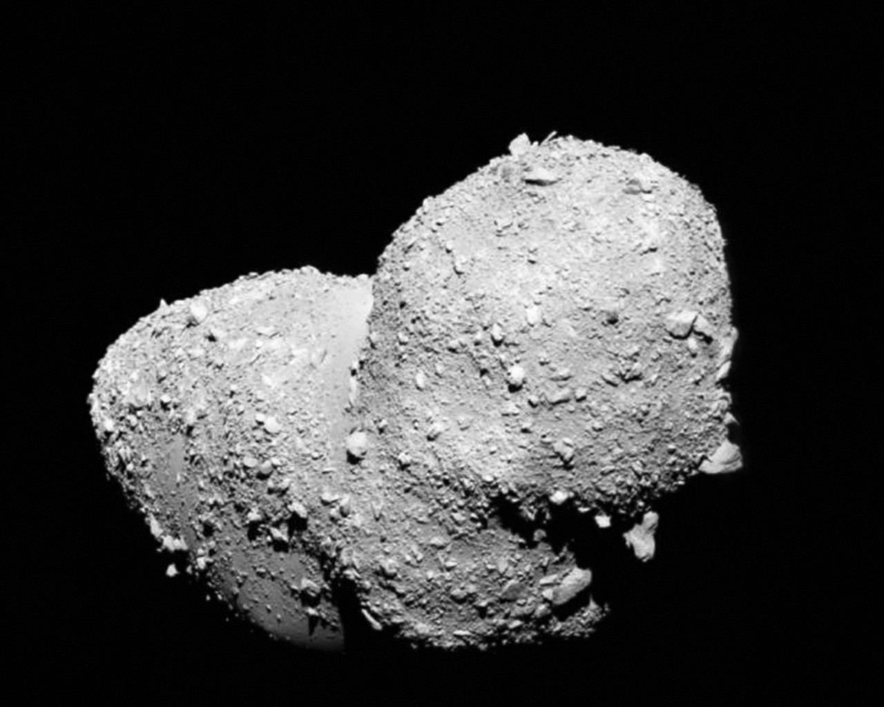 Een close-up van de asteroide Itokawa, gemaakt door het ruimtevaartuig Hayabusa tijdens zijn missie naar de asteroide in 2005.