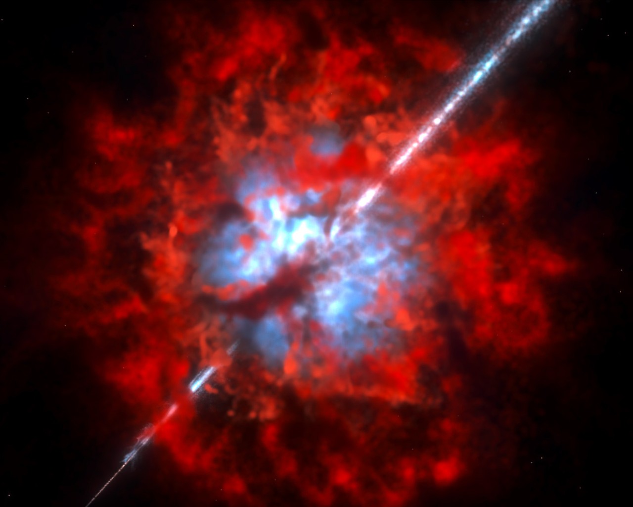 Uitbarstingen van gammastralen zijn te ver weg voor astronomen om ze in detail te kunnen fotograferen. In plaats daarvan heeft een kunstenaar deze afbeelding gemaakt om ons een voorstelling te geven van hoe zoiets eruit ziet.