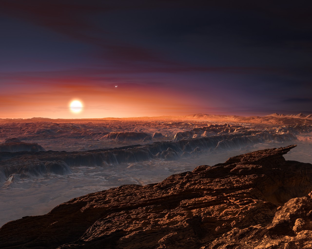 Een nieuwe Aarde-achtige planeet is gevonden rondom de ster die het dichtstbij onze Zon staat. Deze afbeelding is een tekening van een artiest die laat zien hoe het oppervlak van deze spannende nieuwe planeet er mogelijk uit ziet.