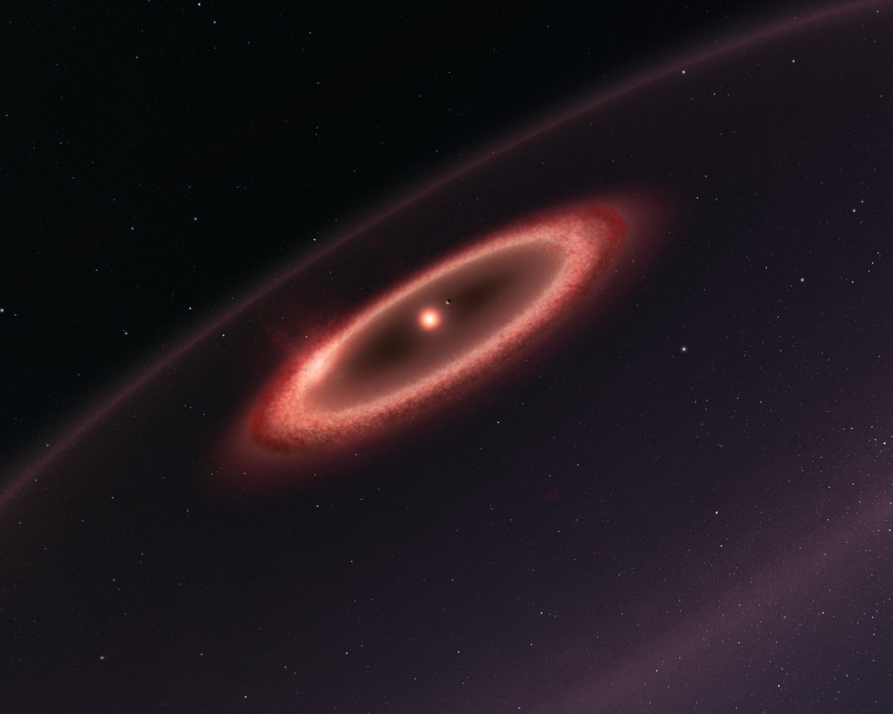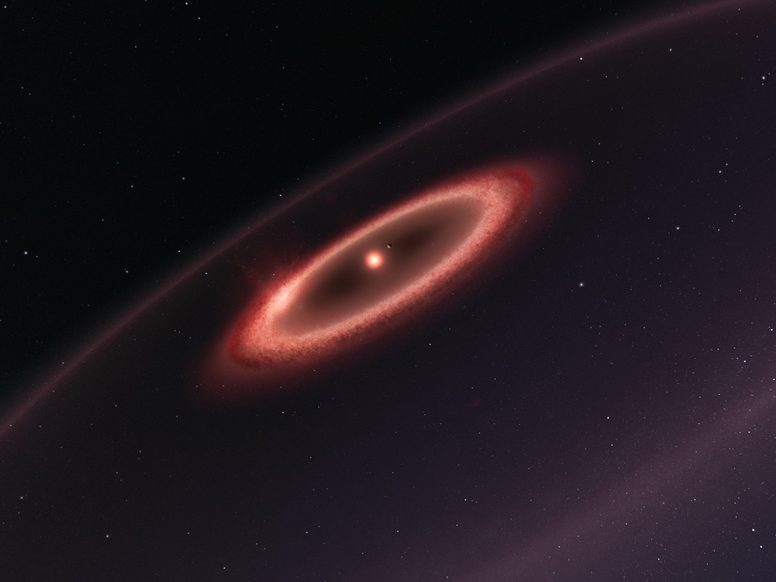 Deze afbeelding is gemaakt door een artiest om ons te laten zien hoe de gordels van stof eruit zien, rondom de ster het dichtst bij het Zonnestelsel. Deze schets is niet op schaal, want in werkelijkheid zou de ster in het midden veel kleiner zijn en de stofgordels veel verder weg.