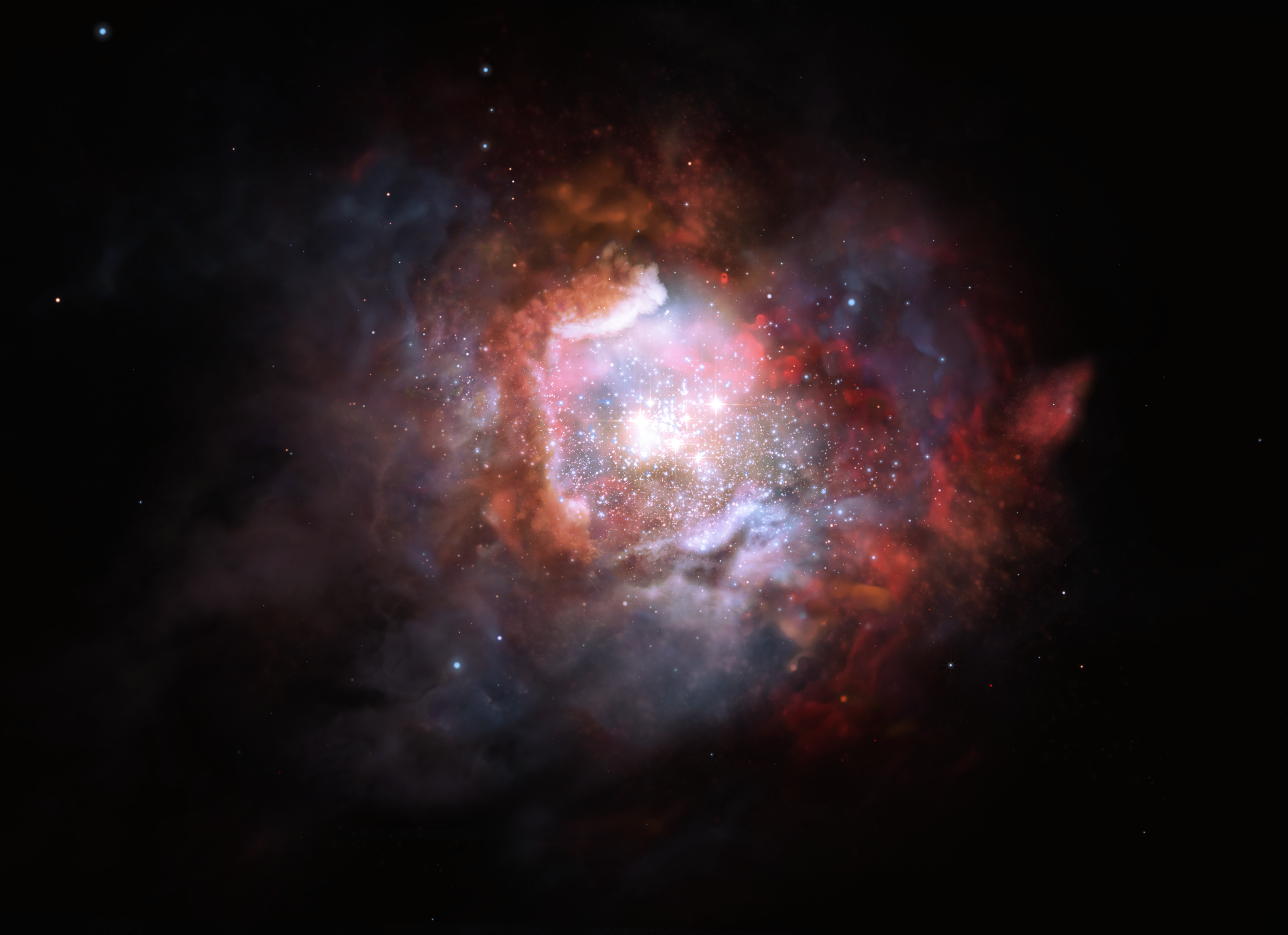 Een illustrator heeft deze afbeelding gemaakt van een zogenaamde Starburststerrenstelsel, een type sterrenstelsel dat 10.000 keer sneller nieuwe sterren kan maken dan een normaal sterrenstelsel!