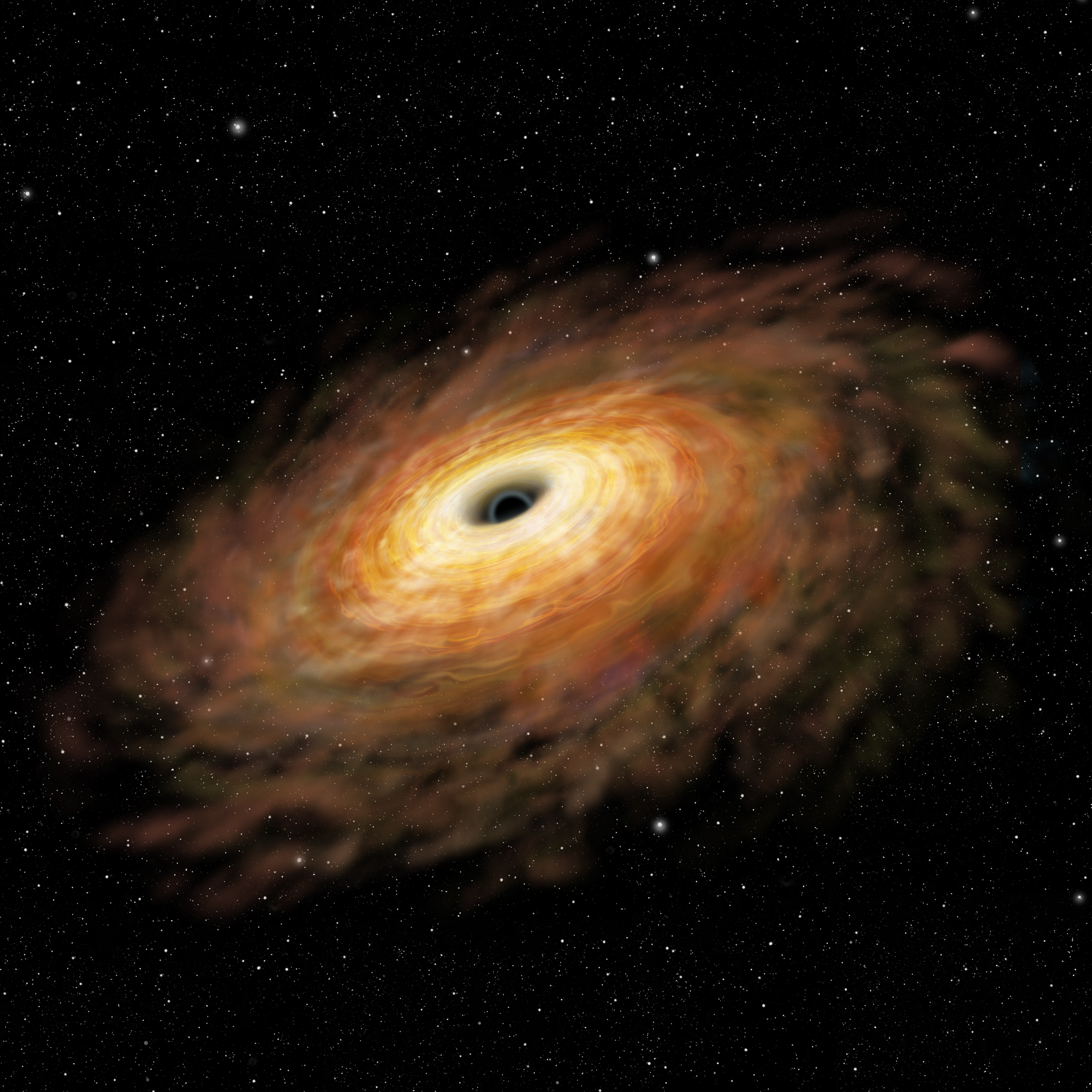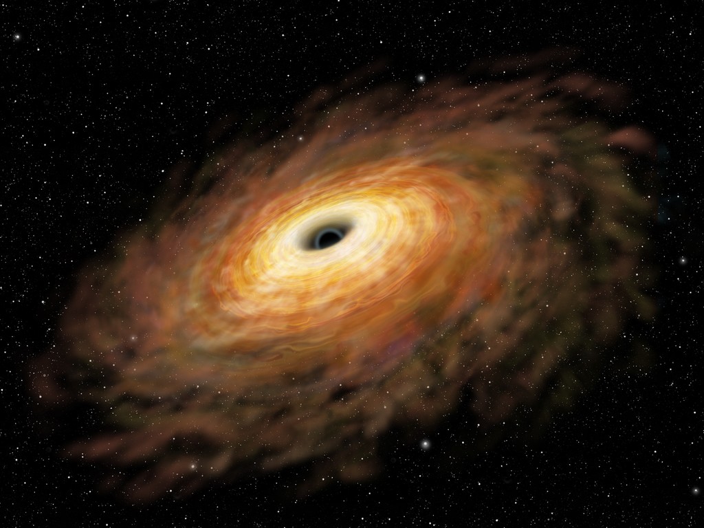 Een artistieke impressie van een sterrenstelsel met een superzwaar zwart gat dat zich aan het voeden is.
