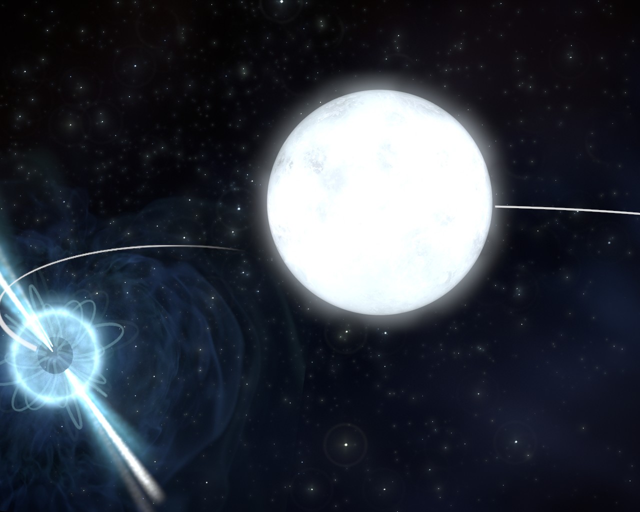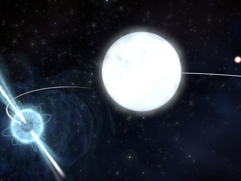 Een kunstenaar heeft deze afbeelding gemaakt om te laten zien hoe een groep van drie sterren bij elkaar wordt gehouden door zwaartekracht. De groep bestaat uit twee kleine witte dwergen (de twee witgekleurde sterren) en een pulsar (de blauwe ster links). De zwaartekracht op een pulsar is twee miljard keer zo sterk als de zwaartekracht op Aarde, waardoor dit een ideale plek is om te testen of Einsteins zwaartekrachttheorie nog steeds klopt voor objecten met super sterke zwaartekracht. Na deze sterren 6 jaar bestudeerd te hebben, hebben onderzoekers bevestigd dat Einsteins theorie ook hier van toepassing was.