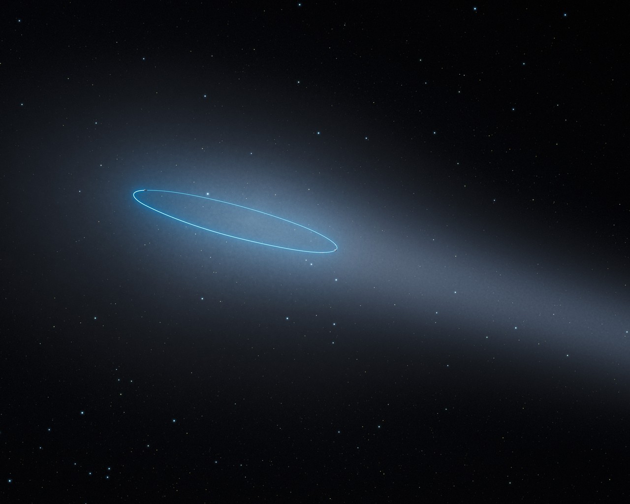 Deze afbeelding is gemaakt door een artiest om een dubbele asteroïde te laten zien die zich gedraagt als een komeet. Net als bij een komeet smelt (het ijs van) de asteroïde in de hitte van de Zon. De baan van de asteroïden is aangegeven met een blauwe ellips.