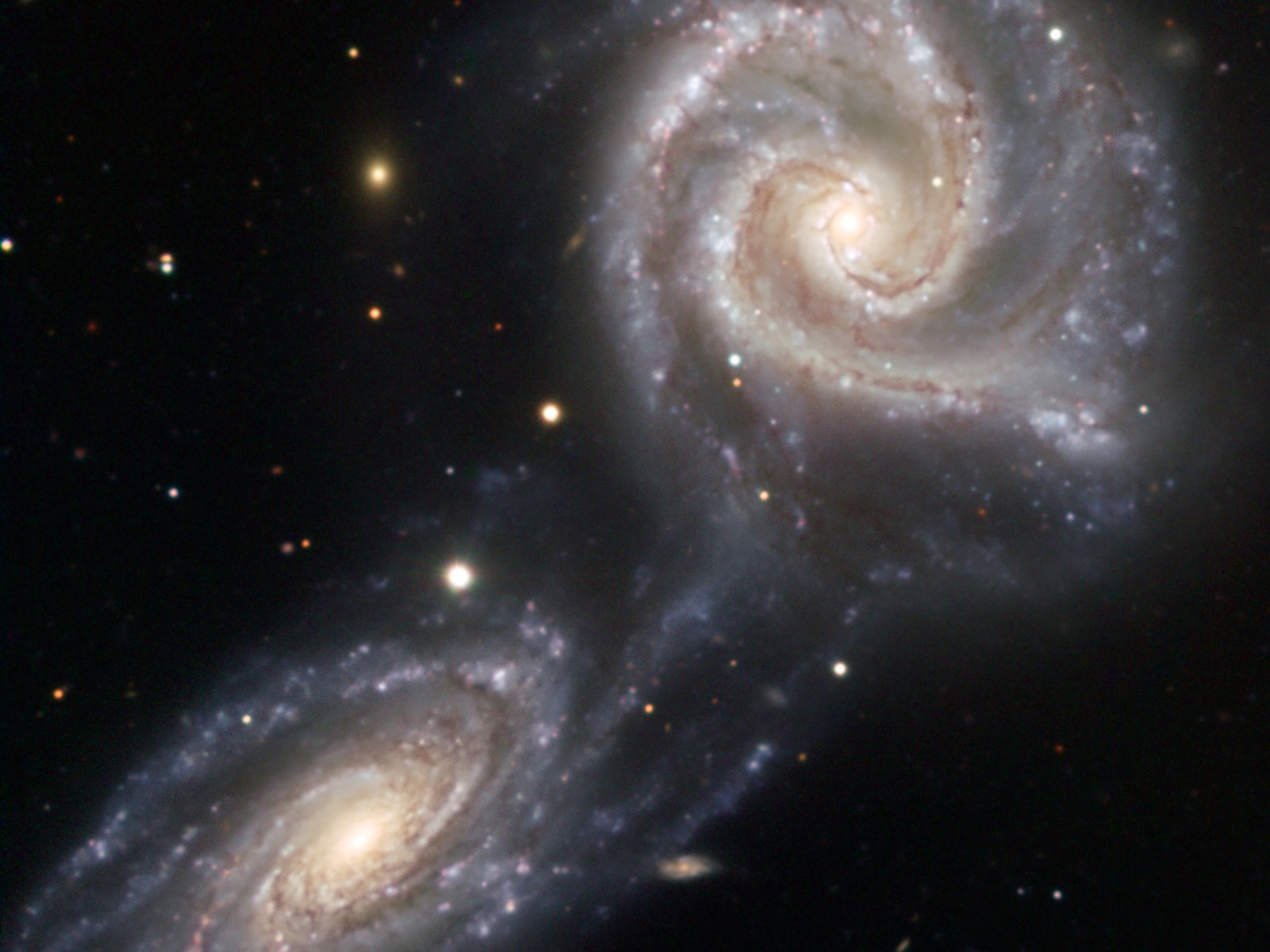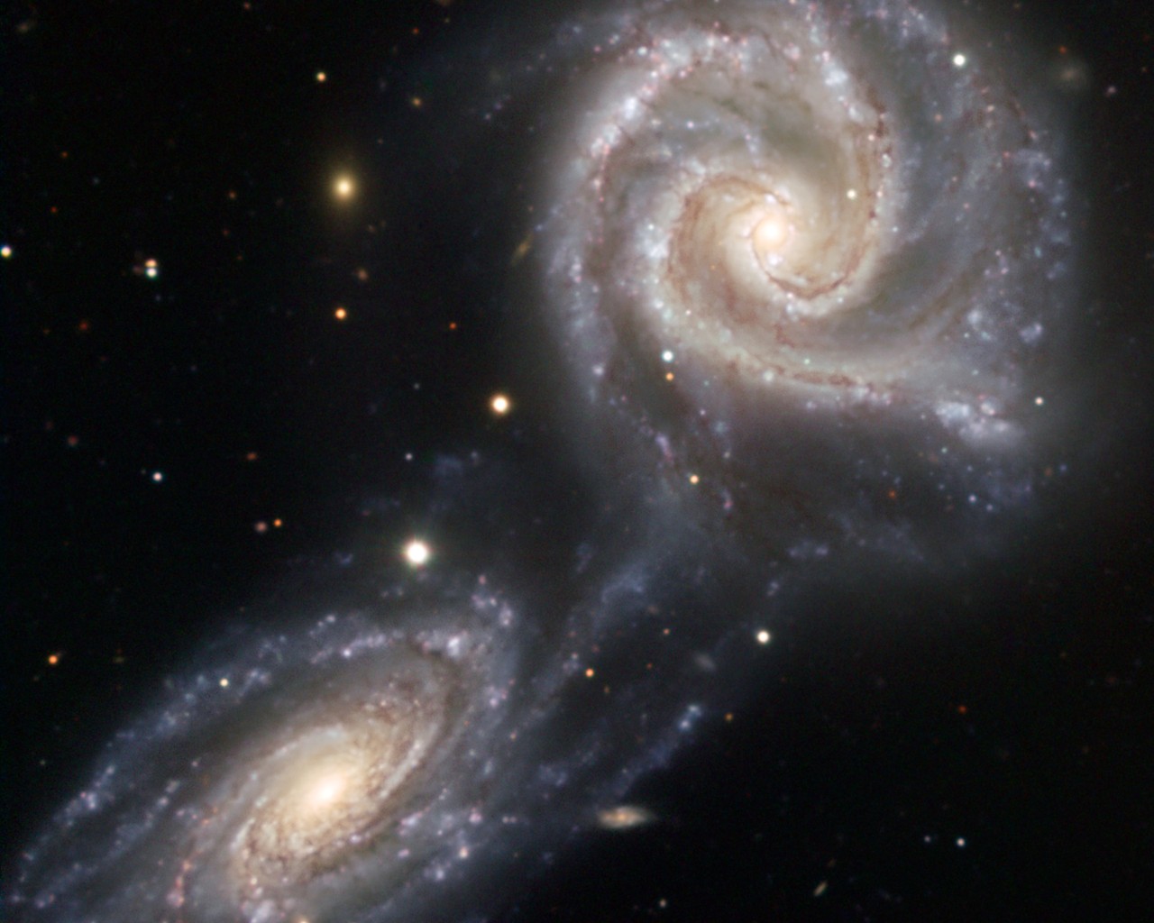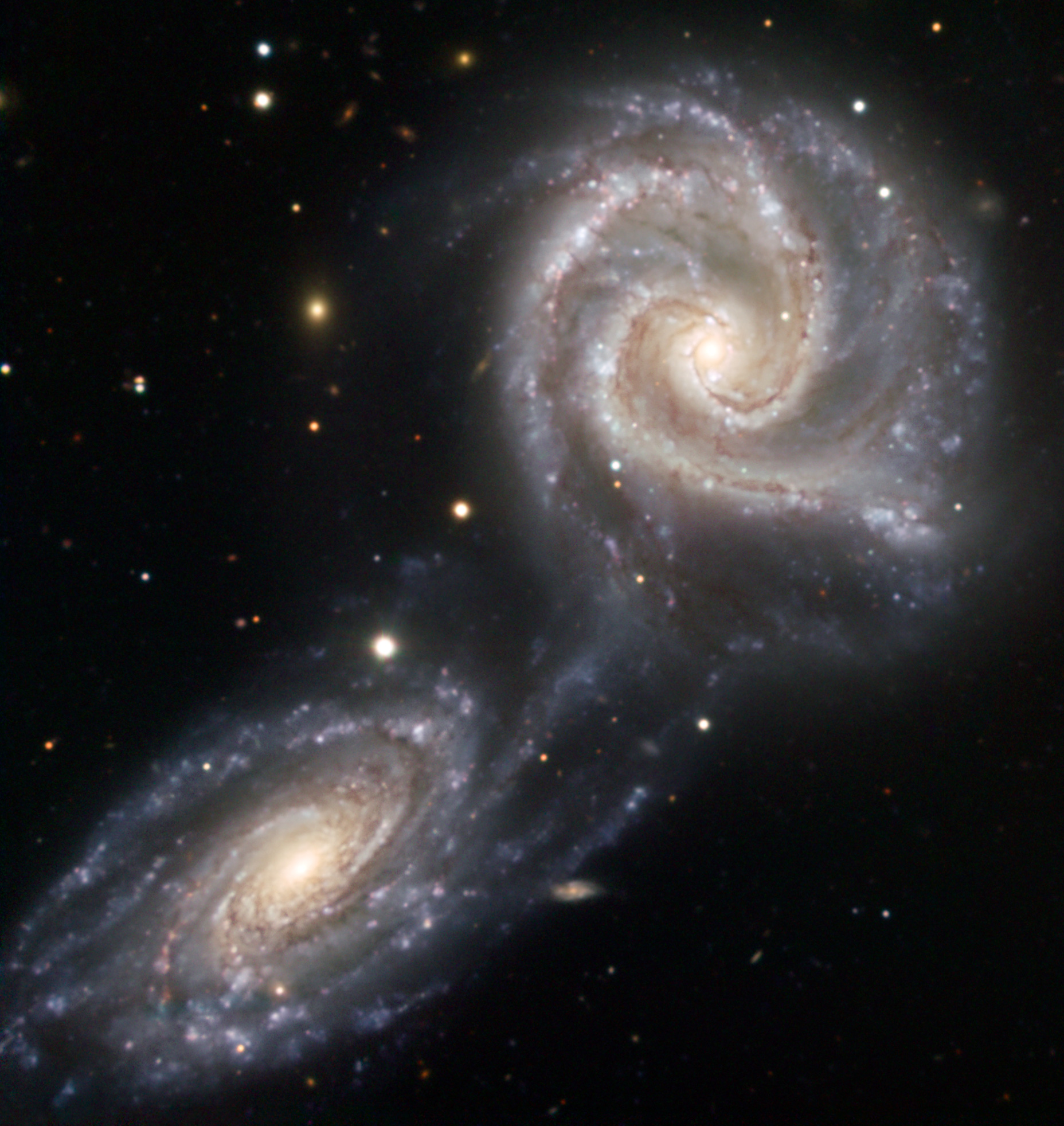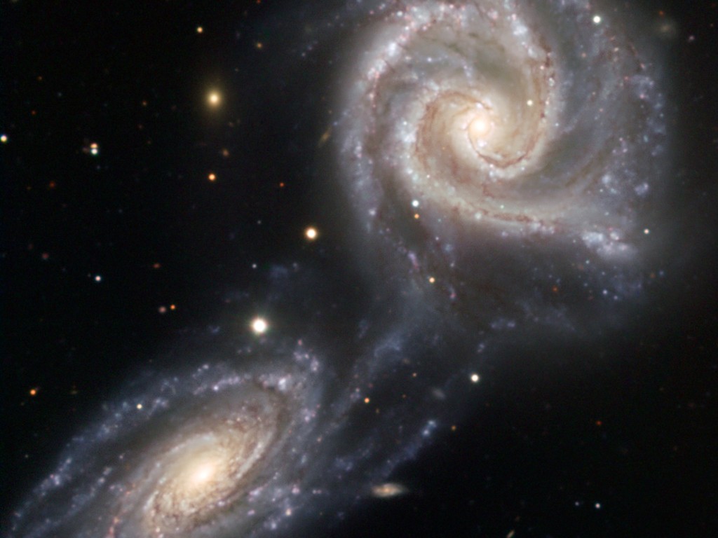 Deze foto laat twee spiraalstelsels zien van vergelijkbare afmeting die verstrikt zijn geraakt in een dramatische dans die nog tientallen miljoenen jaren zal duren! Het is nog onbekend of het zal eindigen in een samensmelting van beide stelsels.