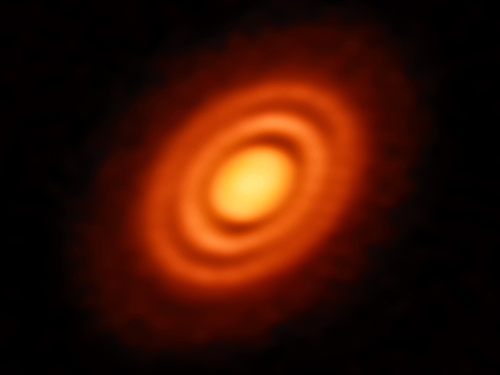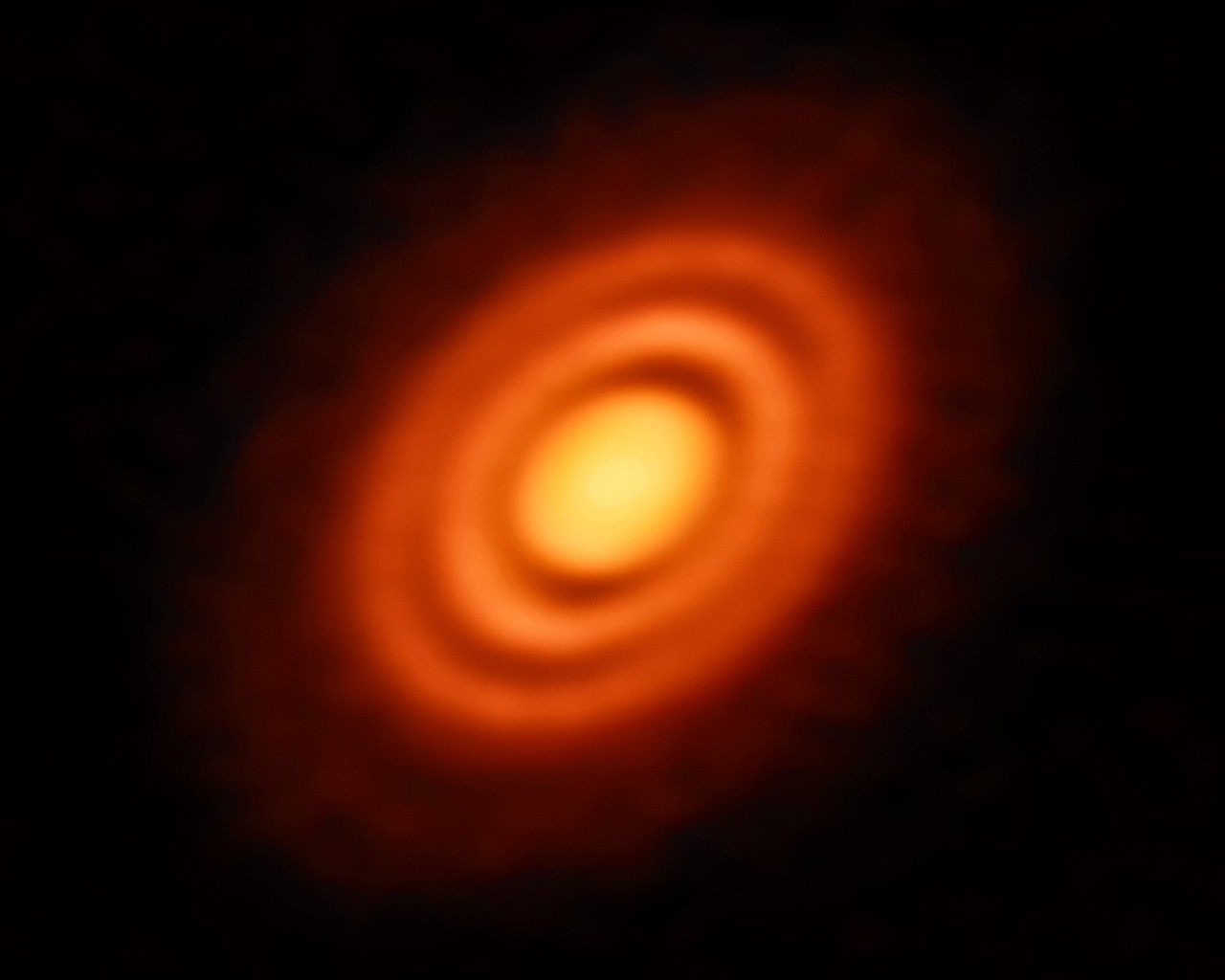 Op deze ruimtefoto is een schijf van overgebleven gas en stof rondom een nieuwe ster te zien. De kringen in de schijf kunnen wijzen op nieuw gevormde planeten die zich rondom deze ster bewegen. Die planeten nemen materiaal op uit de schijf terwijl ze in hun nieuwe baan bewegen.