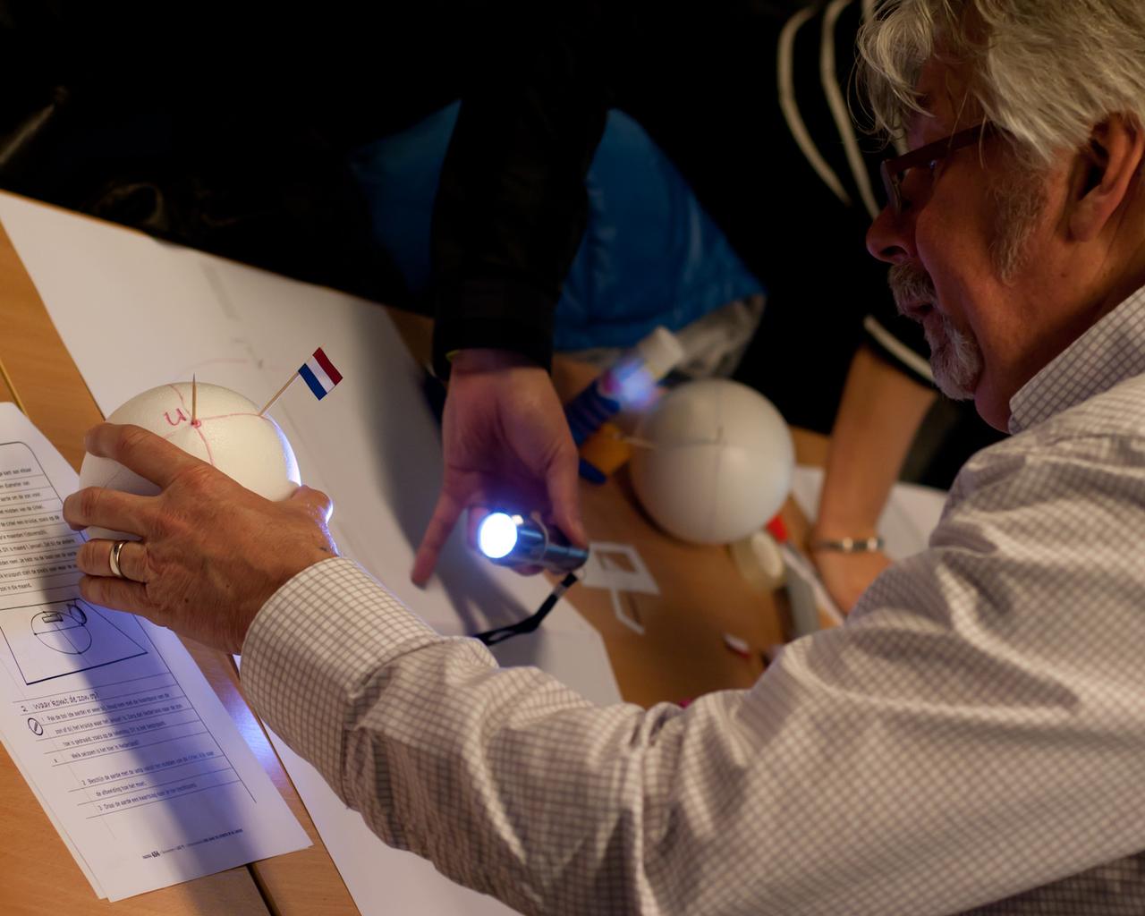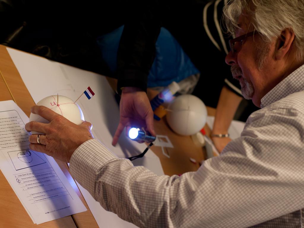 Een basisschool leerkracht zoekt uit waarom in Nederland wel seizoenen zijn, maar in Indonesië niet, tijdens een EU-UNAWE teacher training.