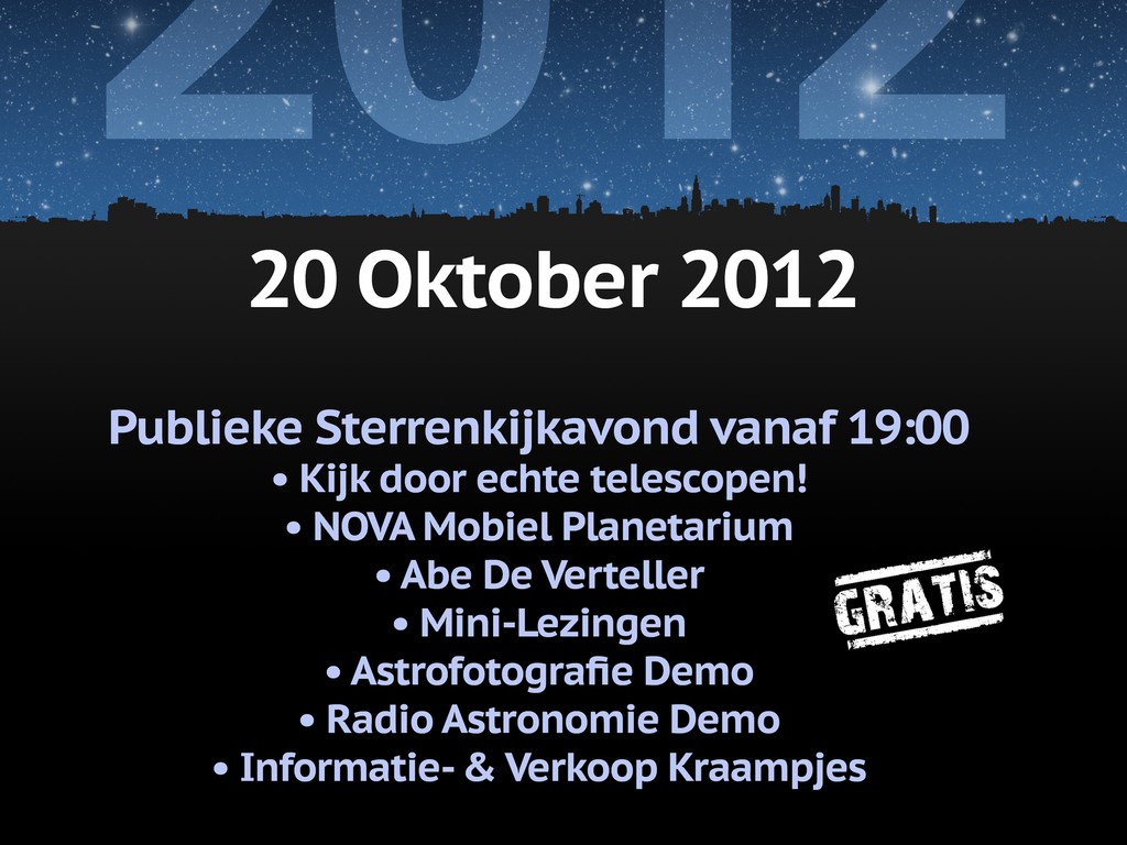 Op 20 oktober 2012 is Amersfoort even het middelpunt van het heelal. Speciaal voor kinderen, ouders en opa’s en oma’s organiseert Publiekssterrenwacht Schothorst in samenwerking met vrijwilligers van Astroforum.nl een sterrenkijkavond. Heb je altijd al eens door een echte telescoop willen kijken? Grijp je kans, op 20 oktober kijk je niet door één maar tientallen telescopen! En met z’n allen weten de aanwezige amateur astronomen een heleboel en er zullen weinig vragen onbeantwoord blijven!