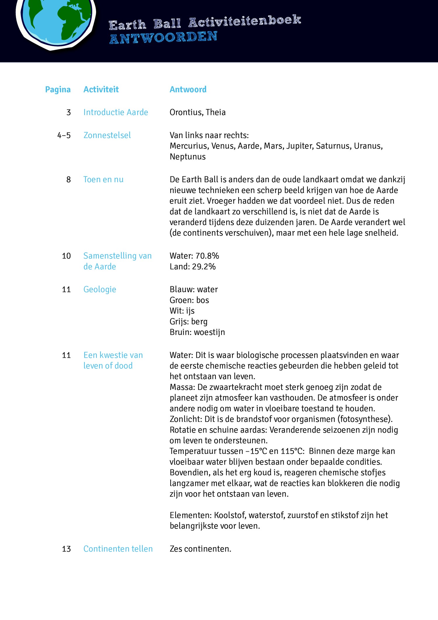 Dit document geeft de antwoorden op de vragen en opdrachten uit het Earth Ball activiteitenboek, wat je kunt vinden via deze link: http://unawe.nl/middelen/lesmateriaal/EarthBall_boek_NL/