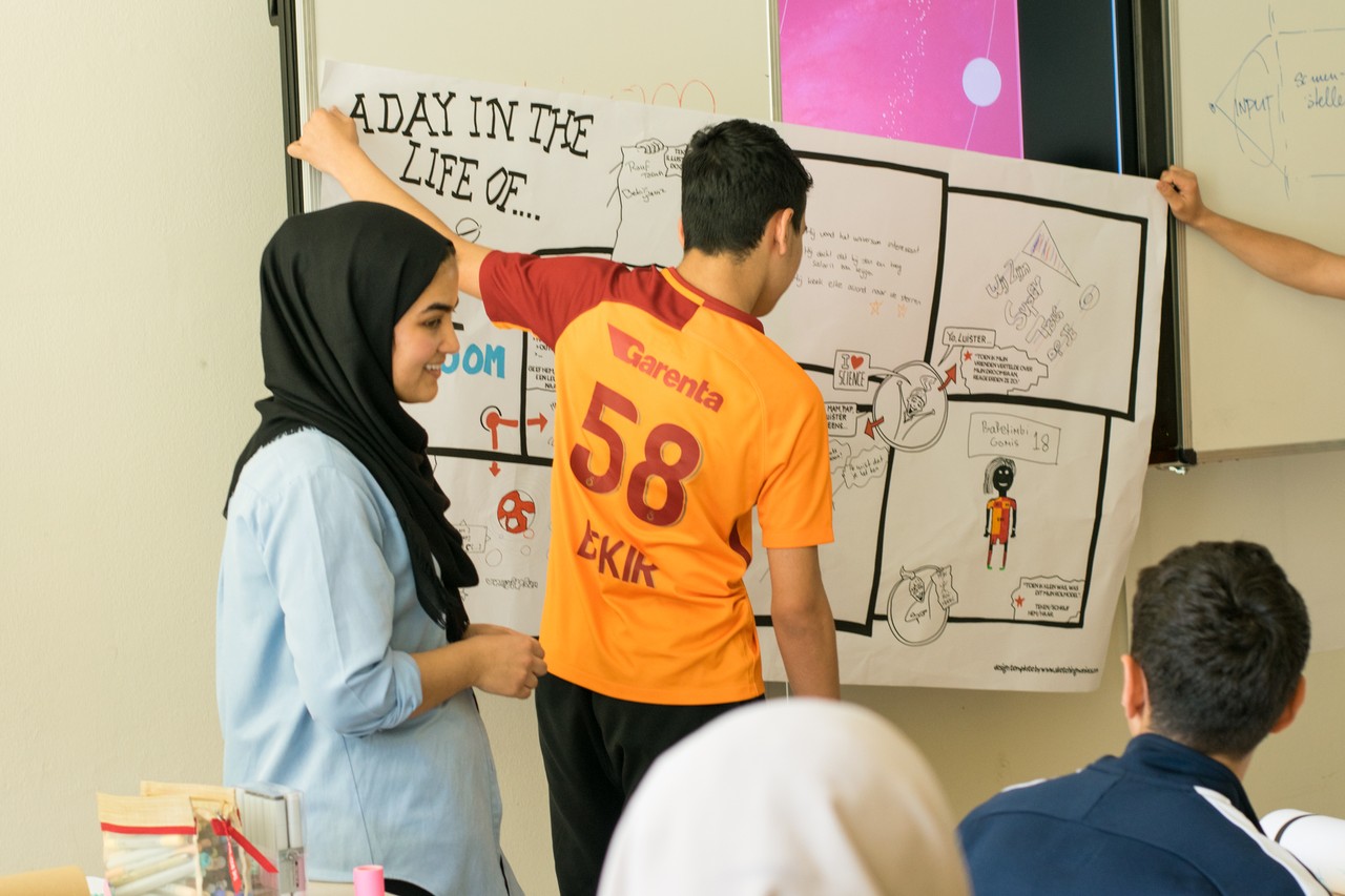 Vervolgens start de workshop. De leerlingen krijgen een beroep, bijvoorbeeld astronoom, toebedeeld waar ze vragen over moeten beantwoorden. De vraag 'wat houdt het beroep in?' is in de meeste gevallen al een lastige en meteen worden de mobiels erbij gepakt om te googlen wat voor beroep het is. Het is de bedoeling dat de leerlingen de antwoorden visueel weergeven door erbij te tekenen. Kunstenaar Edwin Stoop van Sketching Maniacs helpt hen daarbij op weg en geeft ze voorbeelden van hoe ze makkelijk iets moois kunnen ze tekenen.
