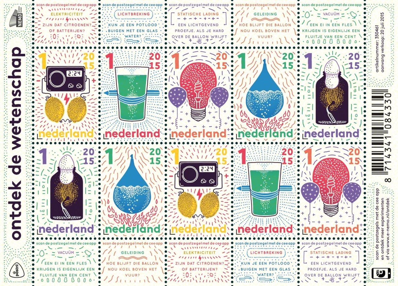 Science Center NEMO heeft in samenwerking met PostNL het postzegelvel ‘Ontdek de wetenschap’ uitgebracht. Op de vrolijk gekleurde postzegels staan vijf natuurkundige experimenten die kinderen thuis eenvoudig kunnen uitvoeren.